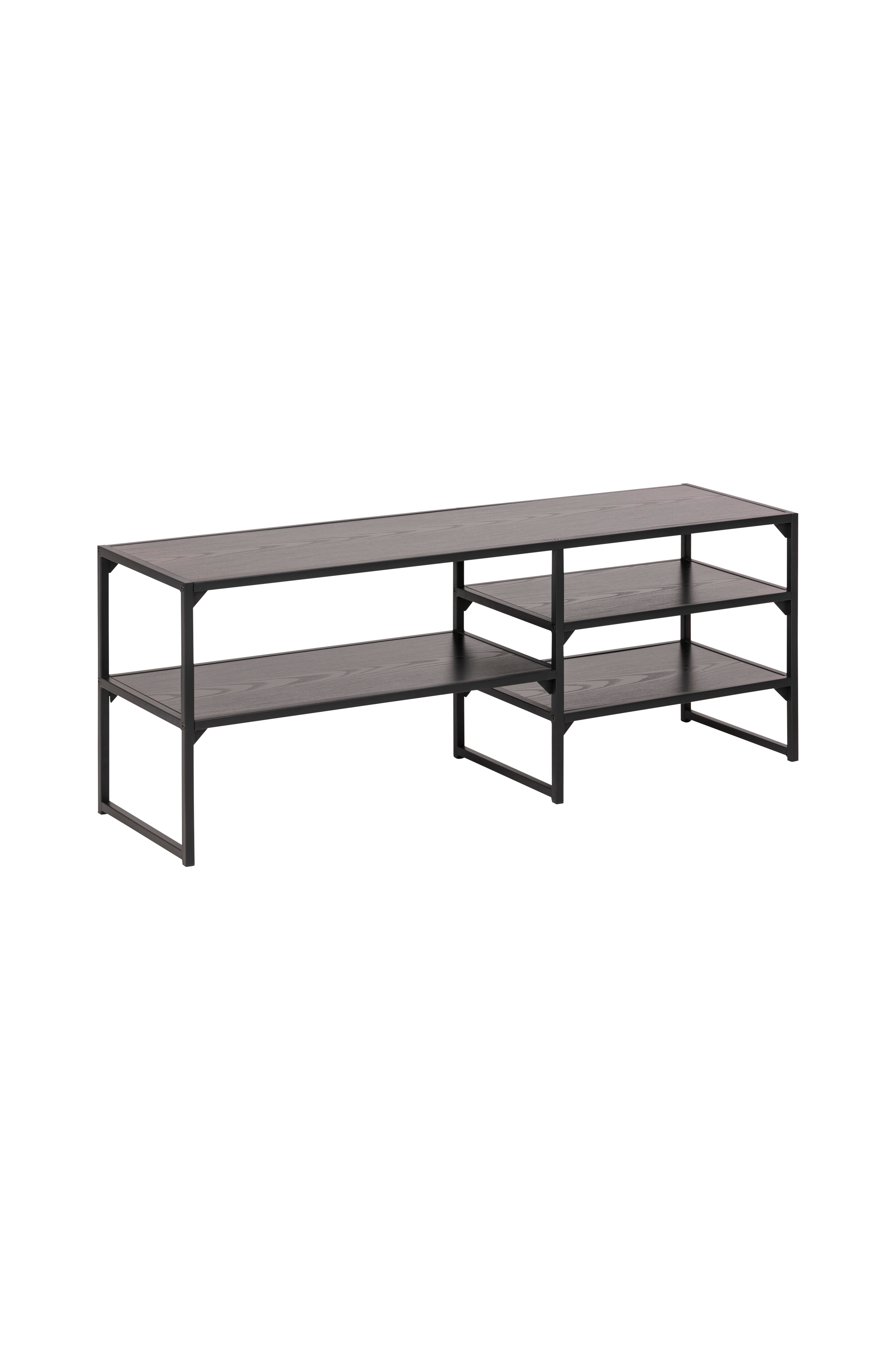 Tv- bänk Agust. Askmelamin på MDF skiva med pulverlackad metallstomme. Asymmetriska hyllplan. Mått; bredd 120 cm, höjd 46 cm, djup 33 cm. Levereras omonterad.