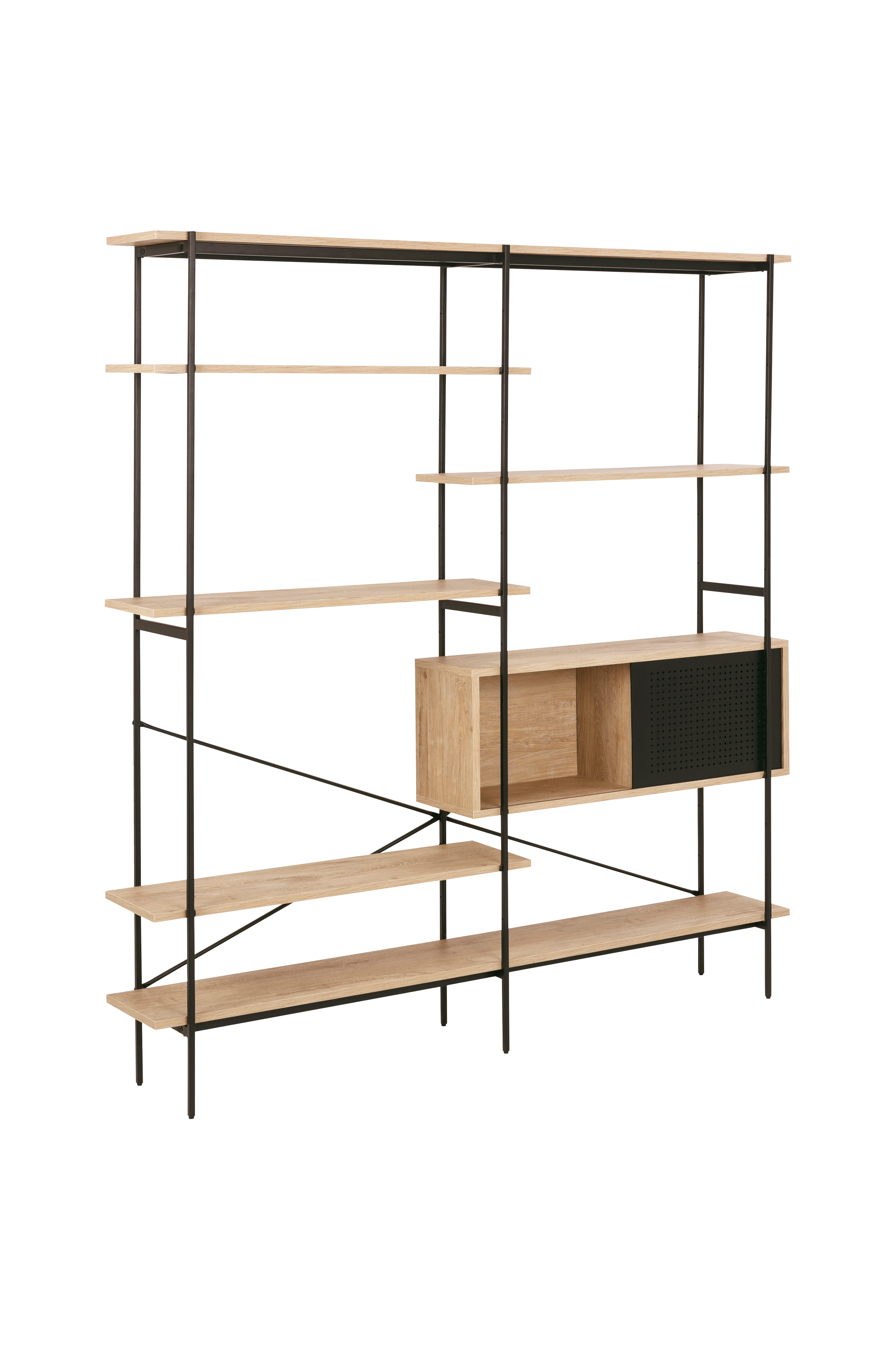 Zelda bokhylla, folierad. Hyllor och skåp på en matt pulverlackad metallstomme. Mått: Bredd 172, djup 27, höjd 188 cm. Montera själv.