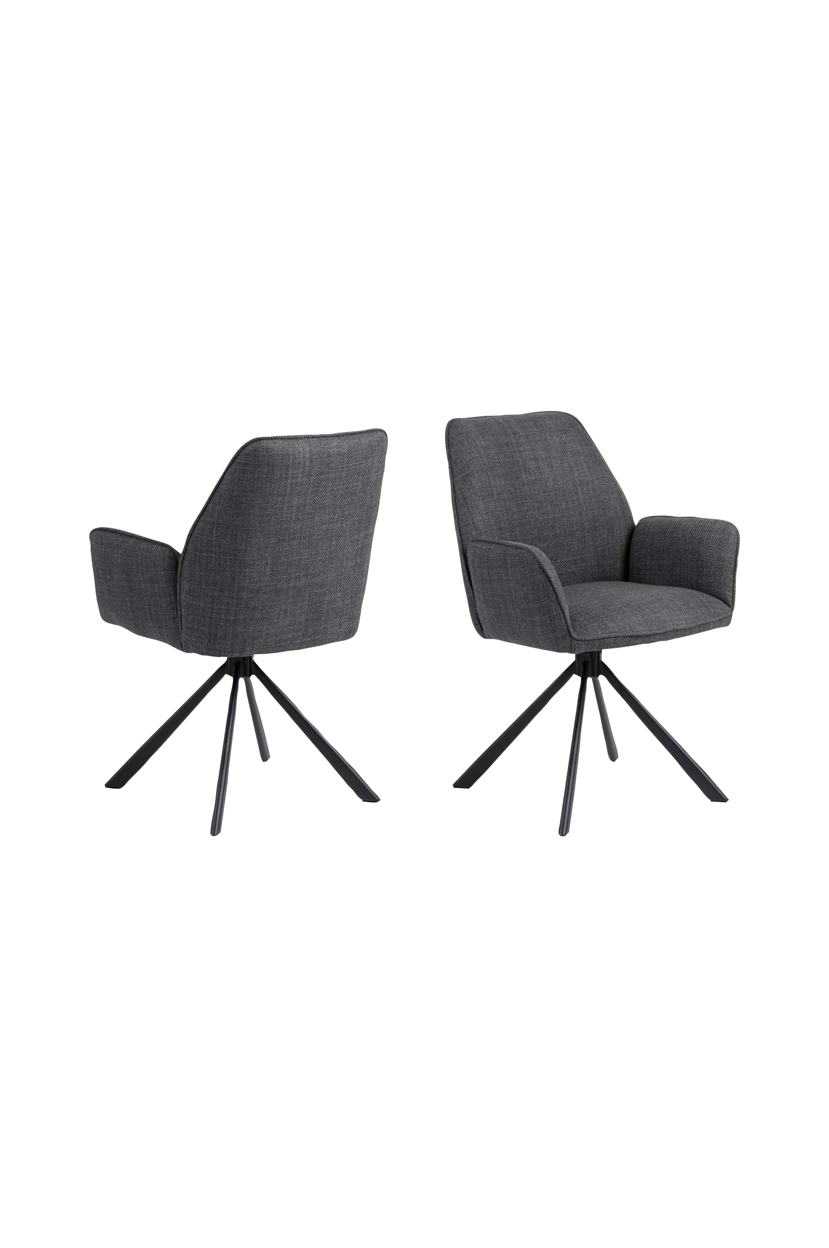 Glenda matstol med armstöd, basel tyg mörkgrå 19, 4-stjärnigt underrede matt svart grovt pulverlackerat stål, med snurr, låda 2 st - matstolen lyfter varje matsal med sin moderna silhuett och är utsmyckad med ett mörkgrått tyg med tvåfärgad effekt och pipingdetaljer, vilket ger stolen ett strukturerat utseende. Stolen kompletteras av det svarta 4-stjärniga stålunderredet med snurrfunktion och förenar stil och funktionalitet, vilket återspeglar den moderna eran.