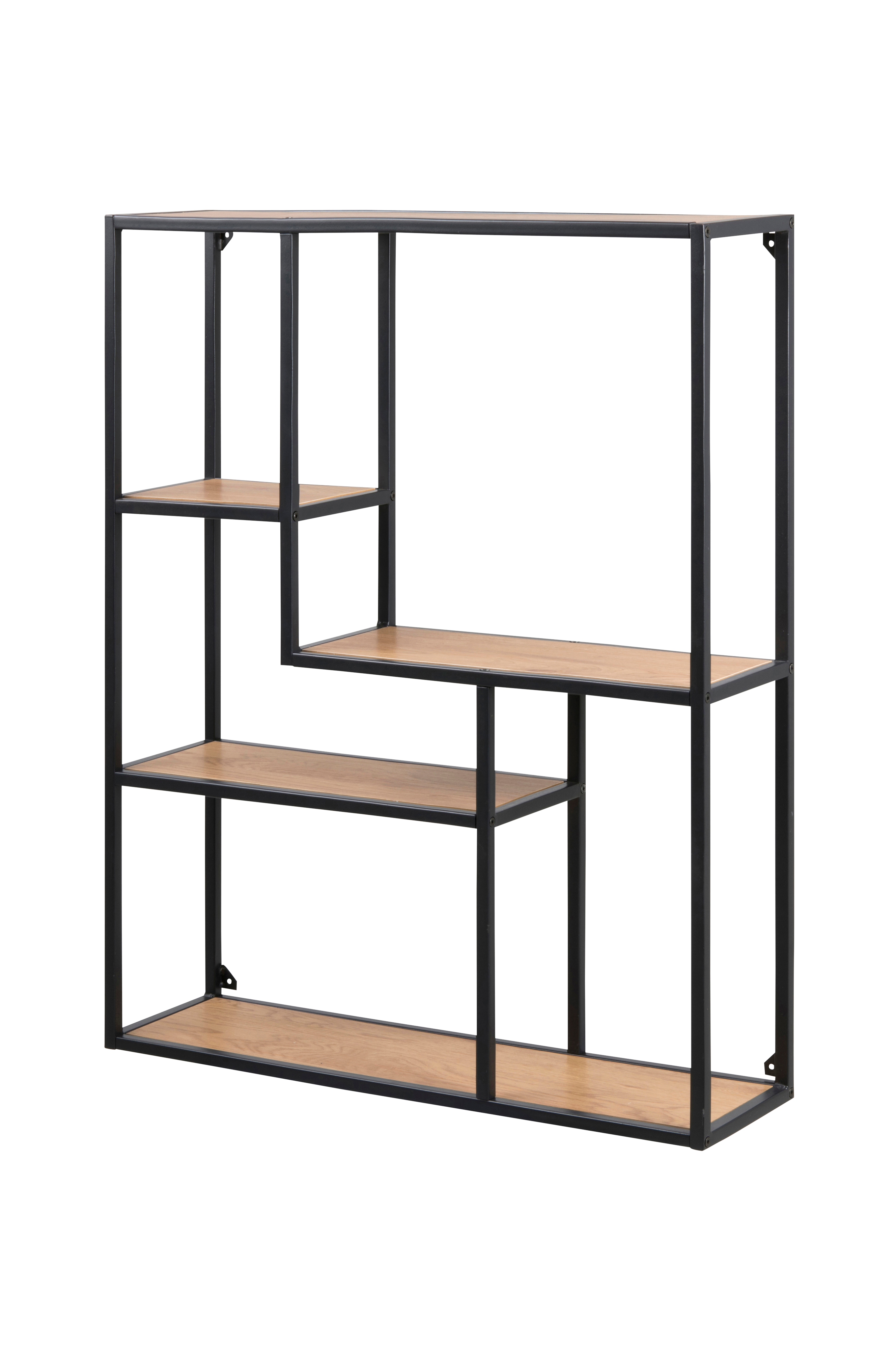 Hylla, pulverlackad metallstomme och ekfolie. Asymmetrisk, bredd 75, djup 20, höjd 91 cm. Levereras omonterad.