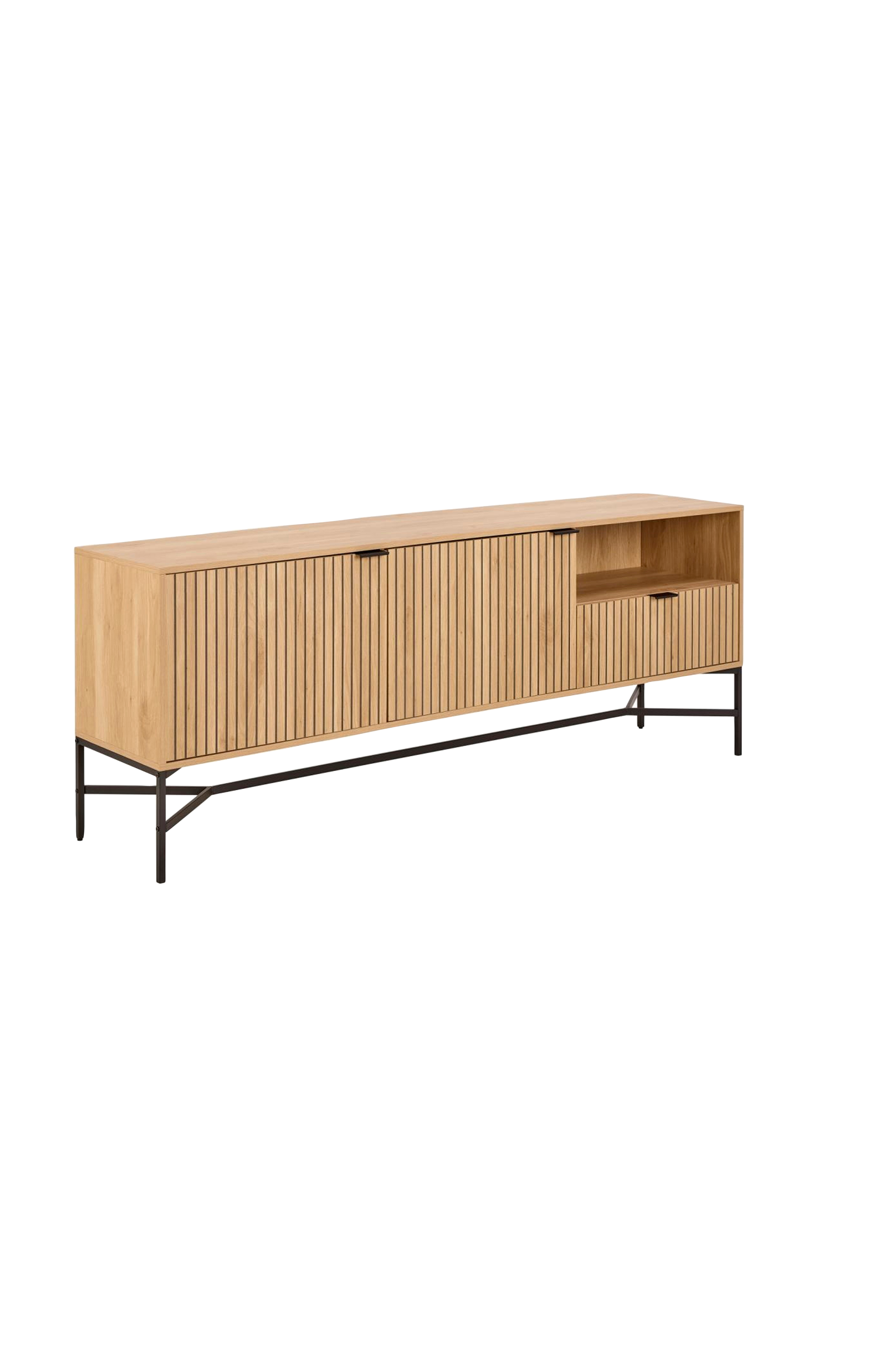 Med sitt minimalistiska utseende är detta sideboard mer än bara en plats att förvara dina saker på - det är en statement piece. Eklooken och den slitsade fronten tillsammans med stålelementen ger ett modernt kontrasterande utseende till alla hem. Sideboardet har en yta som är lätt att rengöra och erbjuder praktisk förvaring med stängda och öppna förvaringsfack.
