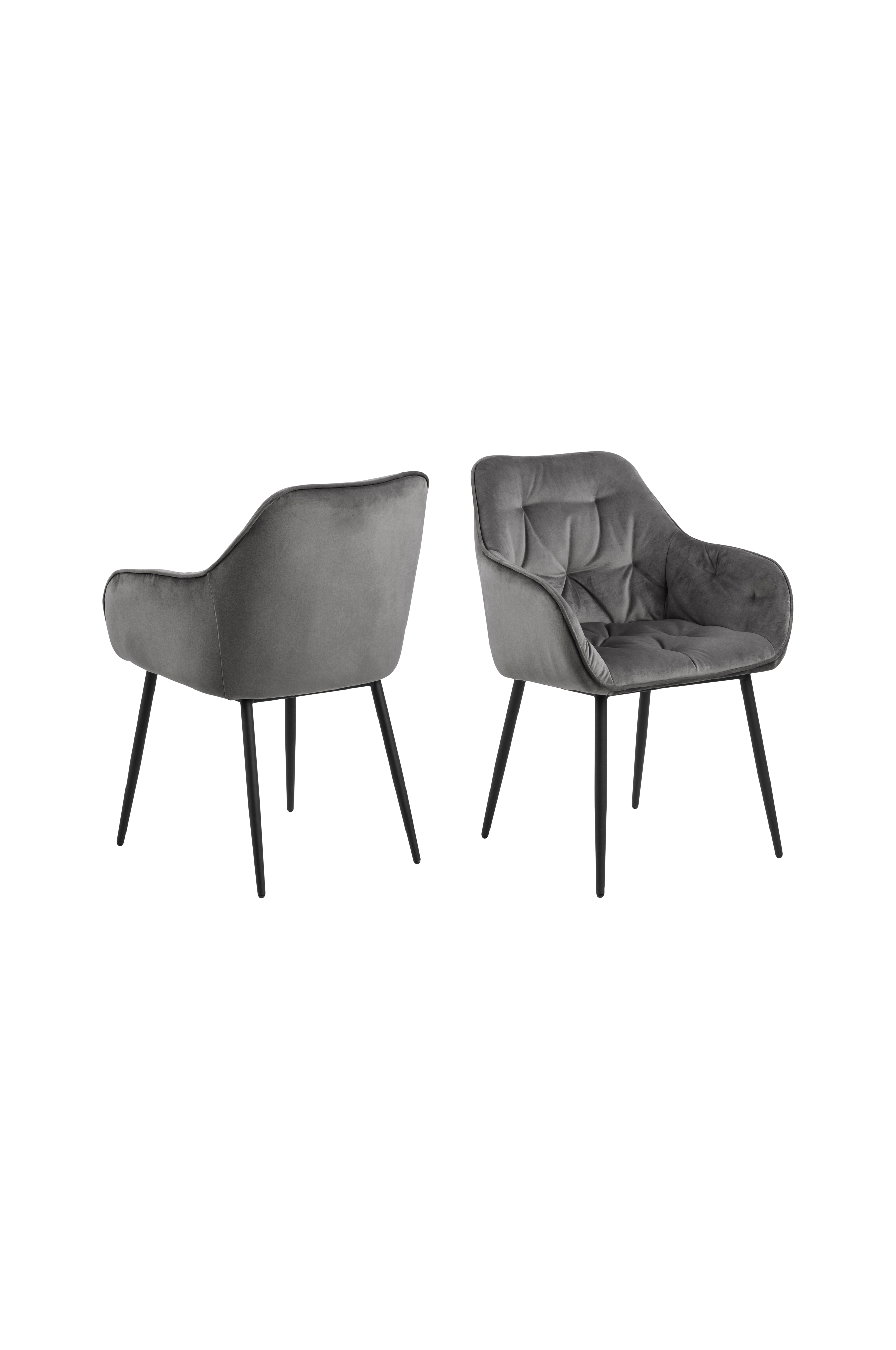 Karmstol Brook, säljs i 2-pack. Men av att pulverlackad metall. Klädd i 100% polyestersammet, stoppad med polyeter och knappar i rygg. Höjd 83 cm, djup 55 cm, bredd 58 cm. Sitthöjd 47 cm. Montera endast ben.