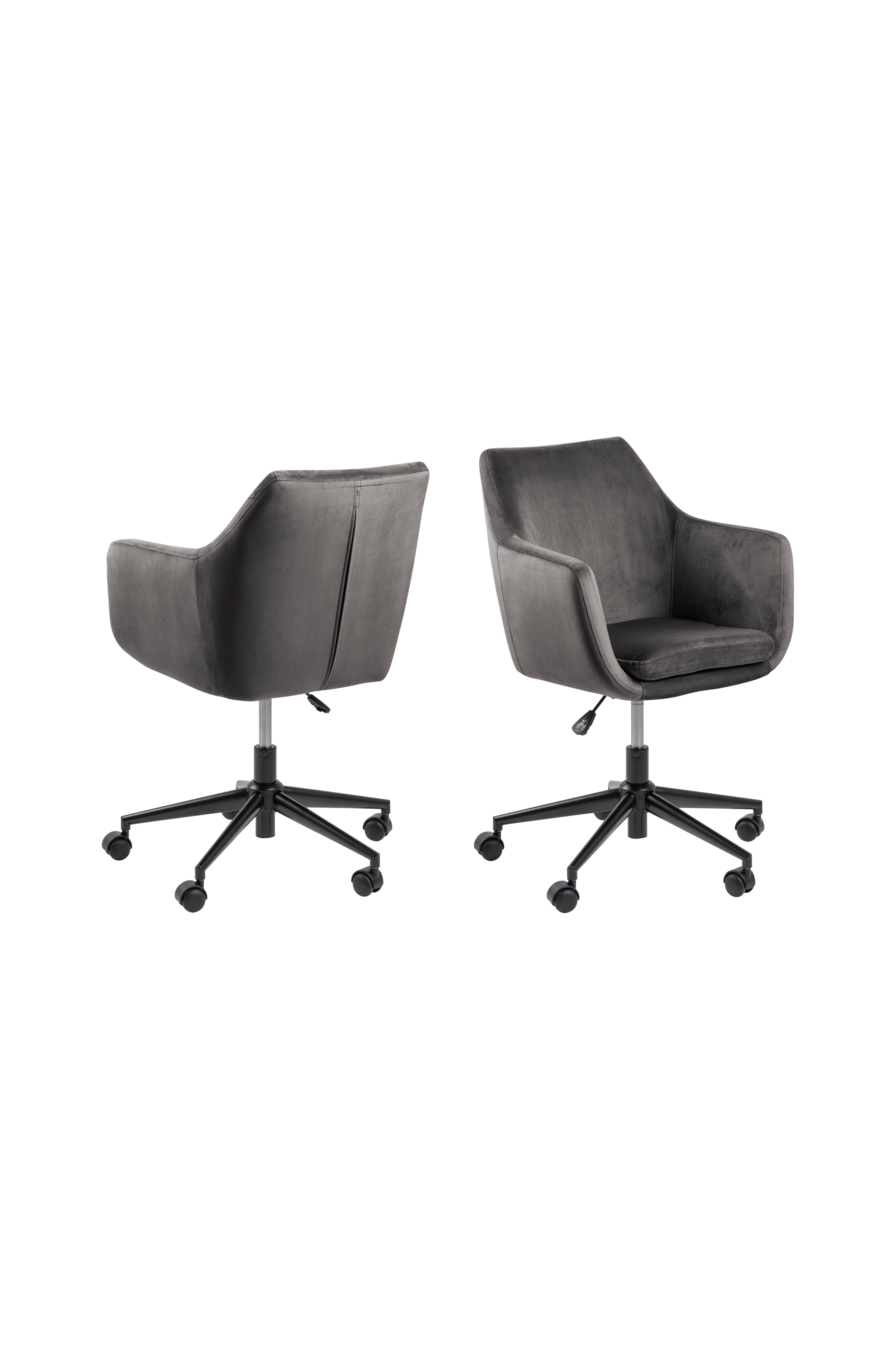 Kontorsstol Laura. Snurr-, höj- och sänkbar. Ben av pulverlackad metall. Sits med polyeterstoppning och klädd i 100% sammetspolyester. Mått; höjd 91 cm, djup 58 cm, bredd 58 cm. Lägsta sitthöjd 44 cm, högsta sitthöjd 54 cm. Armstödets höjd från sitsen 22,5 cm. Levereras omonterad.