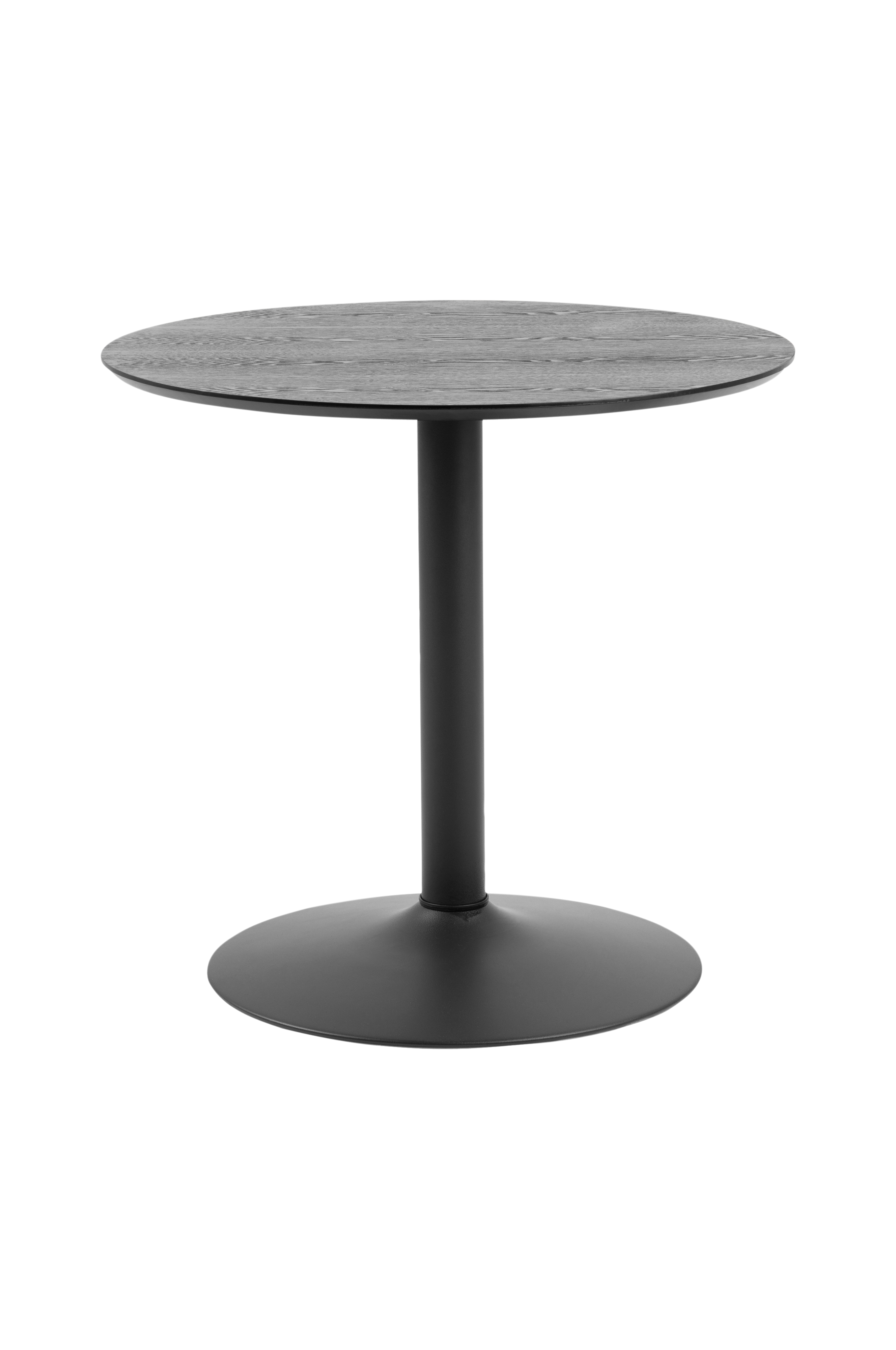 Matbord av lackad askfanerad MDF. Trumpetfot av matt pulverlackad metall. Mått Diameter 80 cm, höjd 75 cm. Diameter på foten: 56,3 cm. Levereras omonterat.