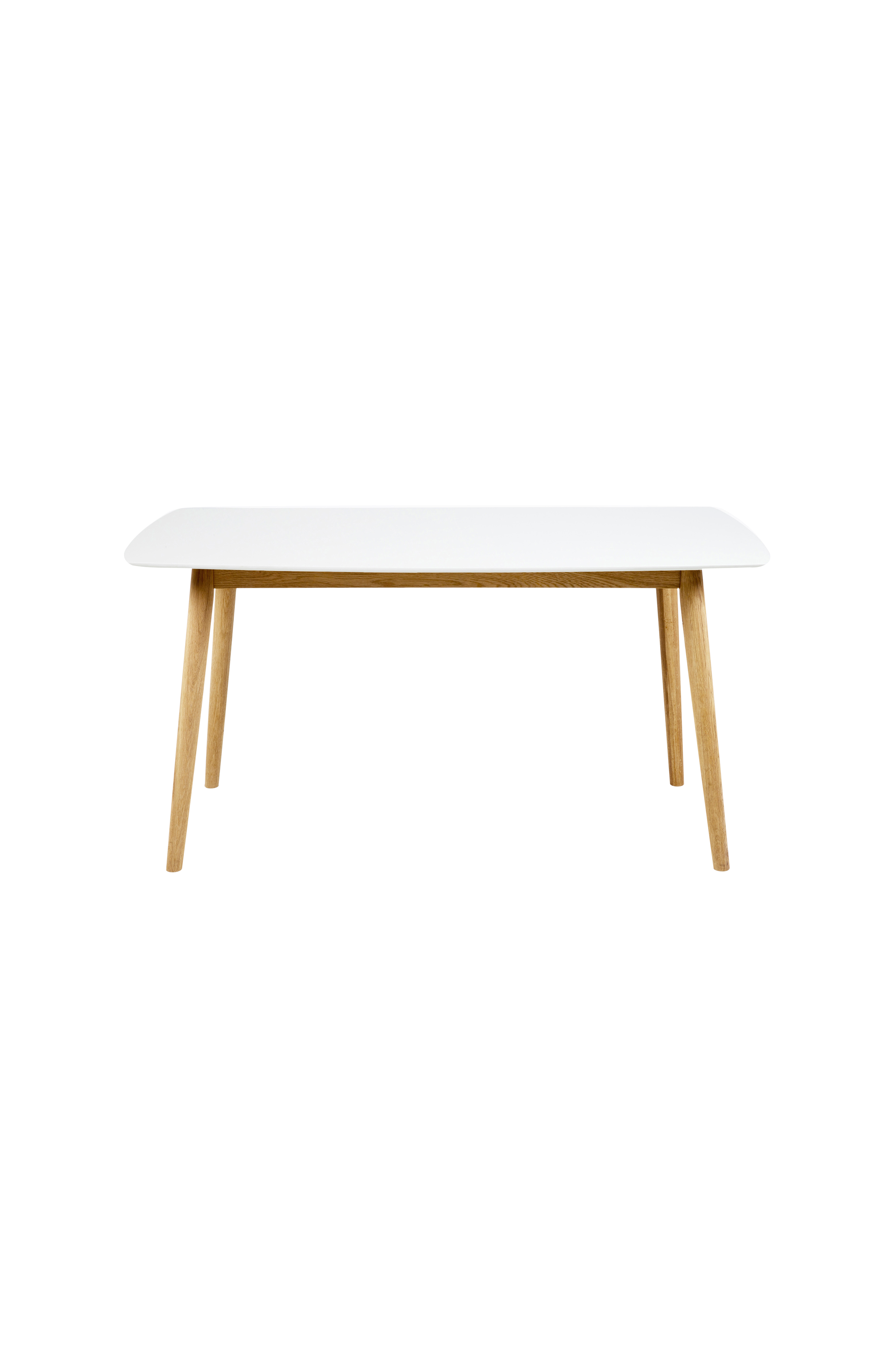 Matbord av ekfanérad skiva, massiva ek ben. 150x80, höjd 75.5 cm. Montera själv.