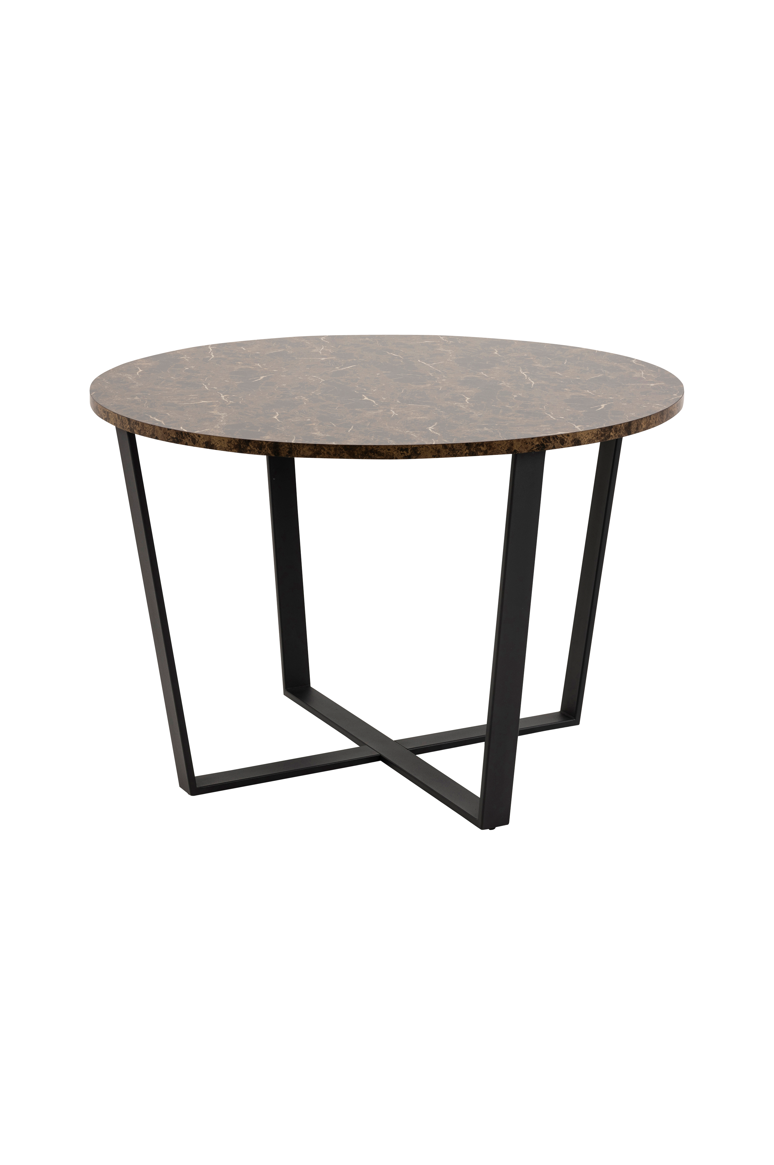 Tea matbord topp av melamine med marmorprint. Stomme av pulverlackad metall. Mått; Diameter 110 cm, höjd 75 cm. Montera själv.