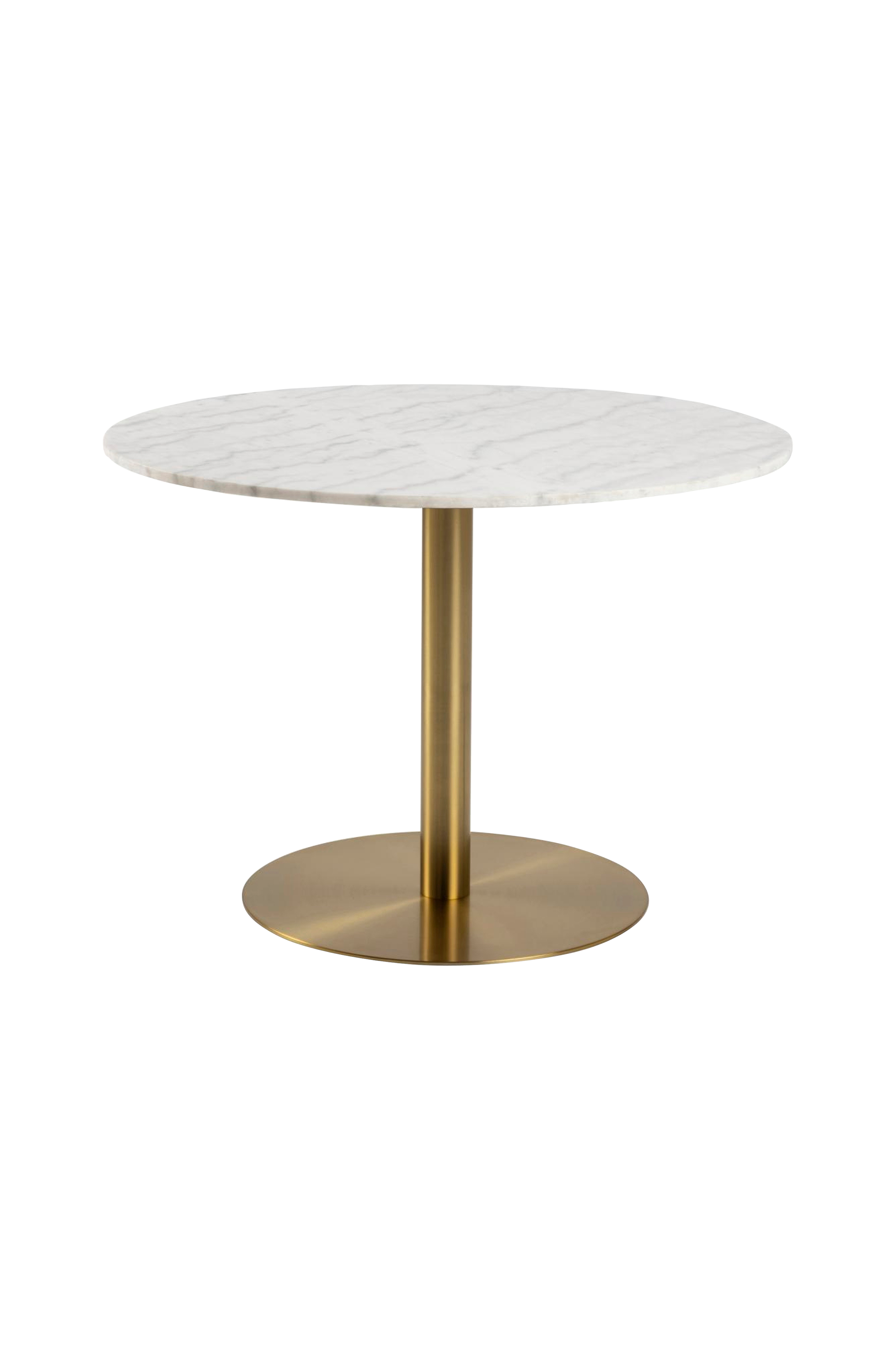 Detta matbord, med polerad, vit bordsskiva av marmor, ger gott om plats vid middagen. Matbordet passar med alla moderna inredningsstilar och har en rund metallfot av borstad mässing. Bordet är packat i platta paket för enkel transport.