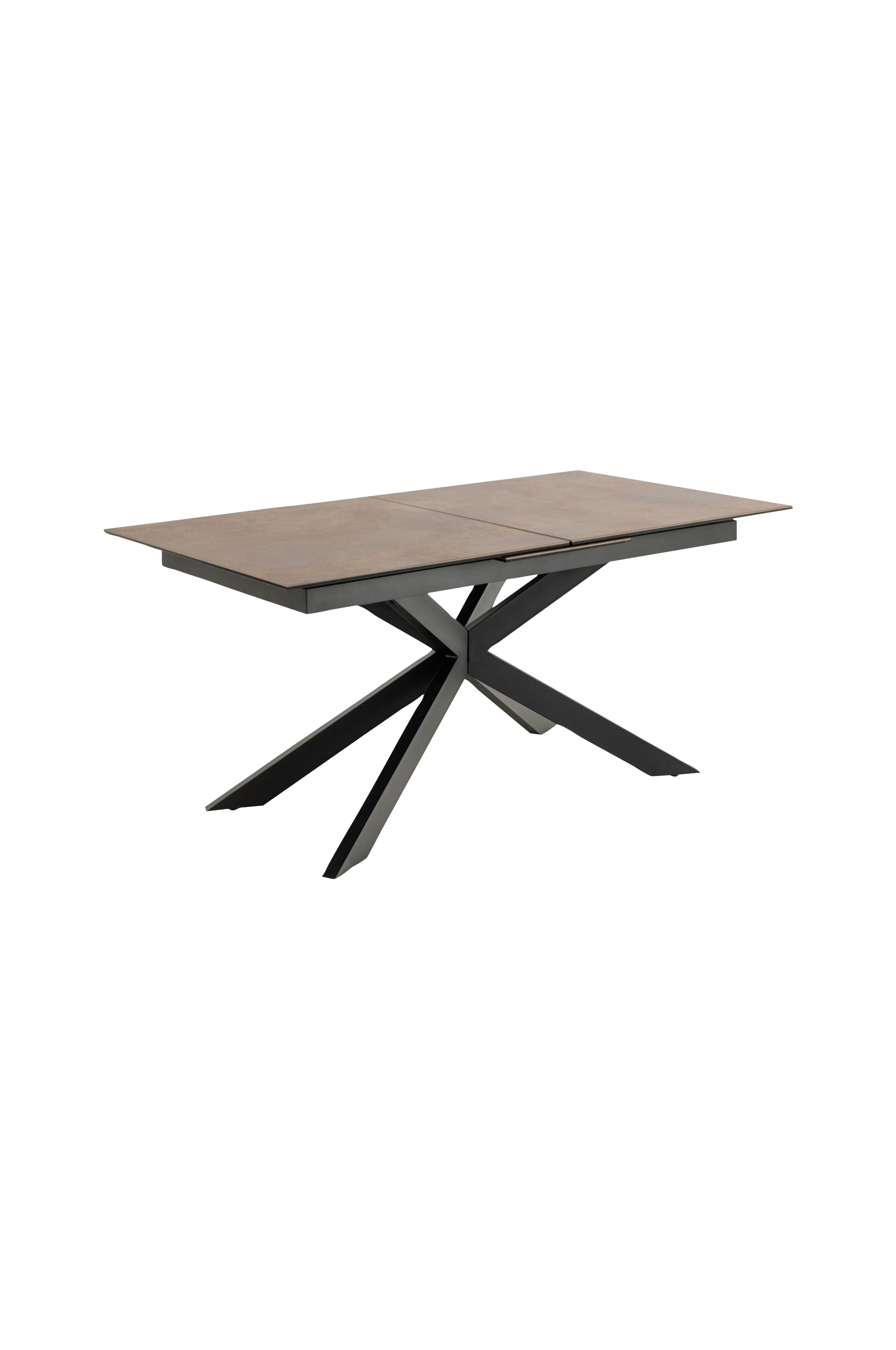 Lägg märke till bordsskivan av brun keramik med rostigt utseende som ger en industriell känsla. Ytan är värme- och reptålig och kräver lite underhåll. Bordet kan enkelt förlängas tack vare förlängningsskivorna. Dra bara försiktigt i bordets ände så dyker förlängningen i matchande keramik upp i mitten. De korsade, svarta metallbenen ger en komplett stil och gör att alla kan sitta bekvämt runt hela bordet.