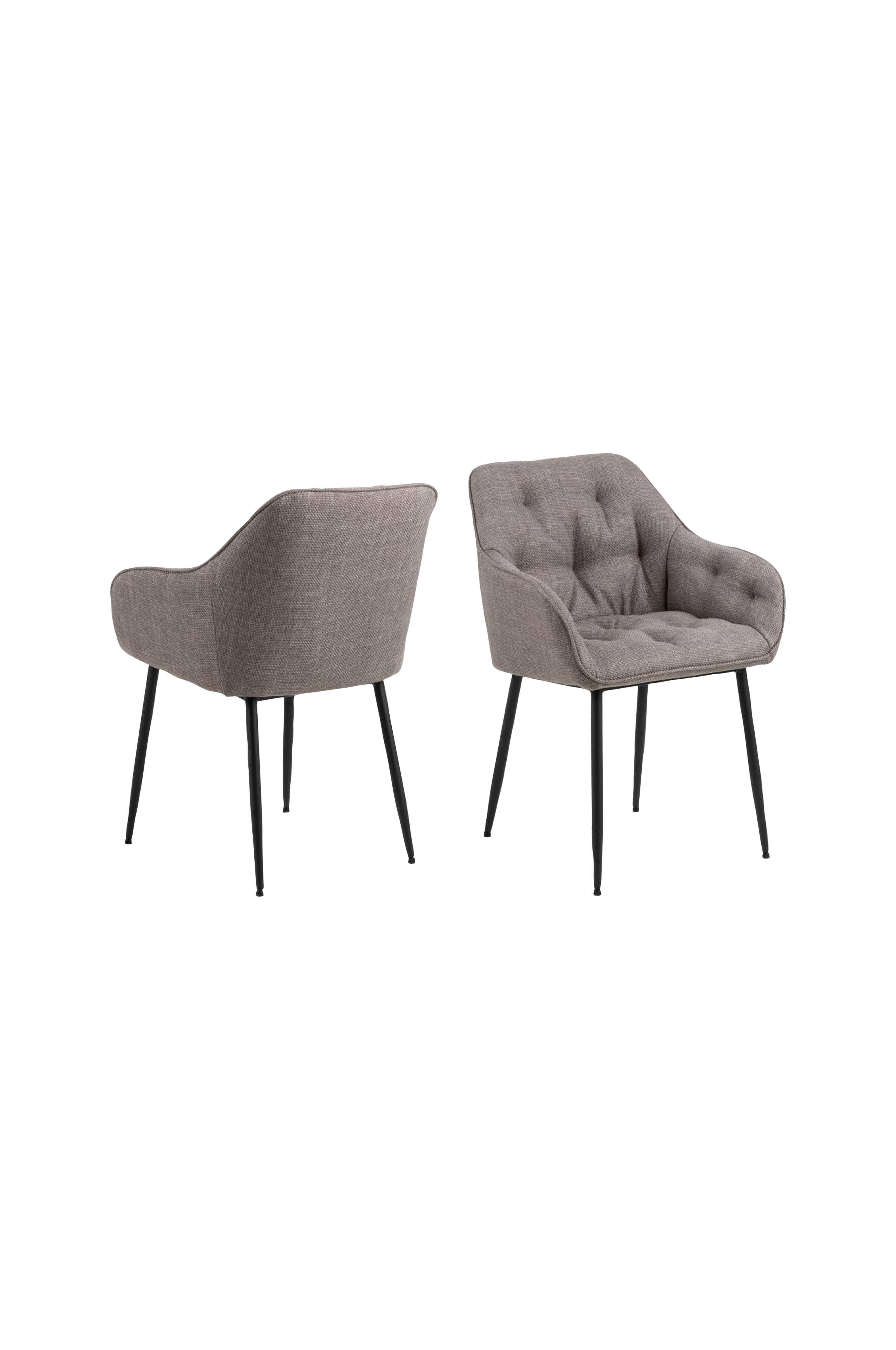 Ge din matplats karaktär med denna tidlösa silhuett. Matstolen är klädd i ett ljusgråbrunt strukturtyg och passar utmärkt för en lång middag. Tuftingdekor ger sitsen textur och struktur. Stolen vilar på runda ben av svart stål.