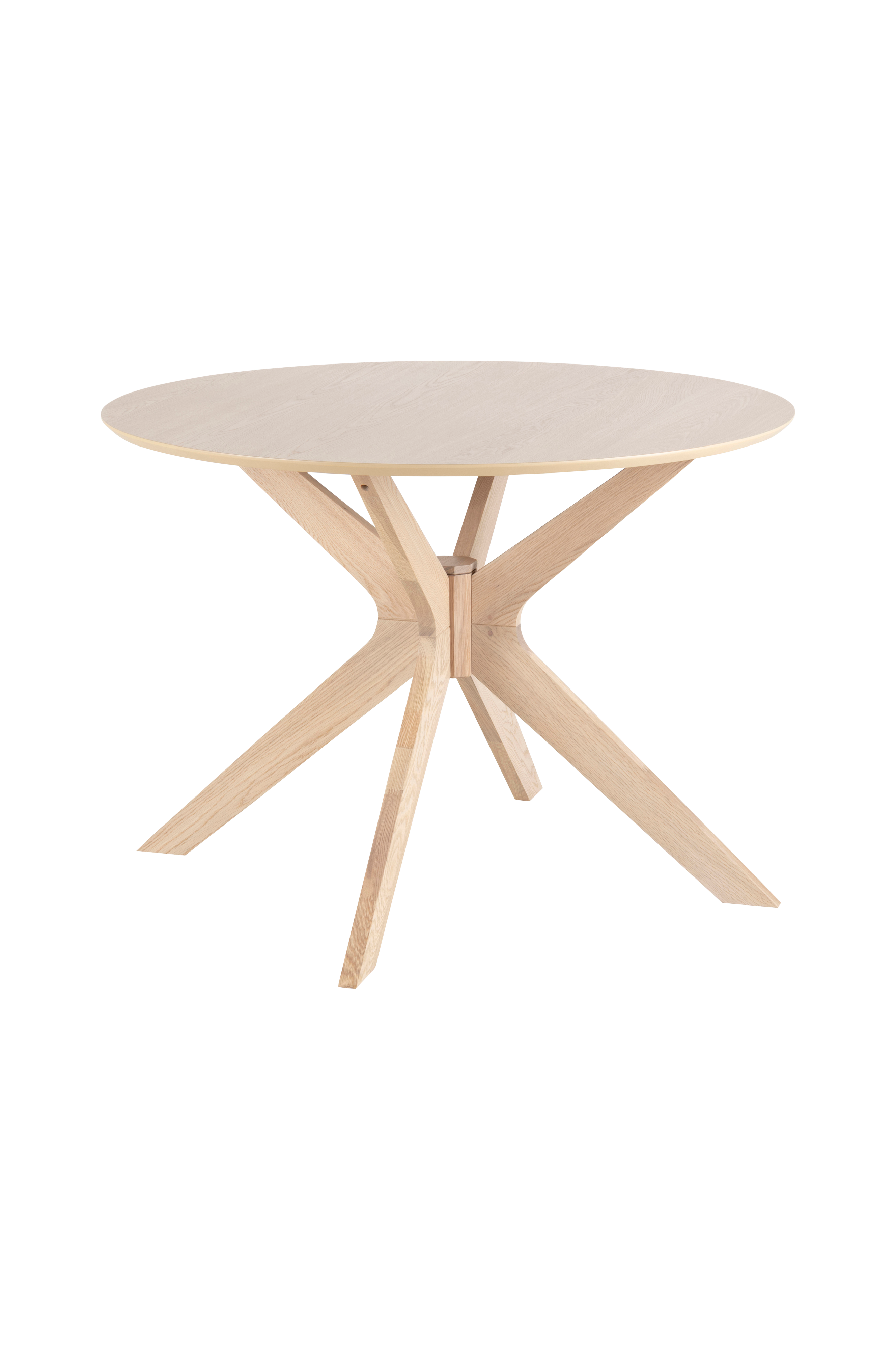 Runt bord av ekfaner med massiva träben. Med ett runt bord brukar man säga att det skapas en mer social stämning då man ser alla runt bordet och kan socialisera sig med alla.