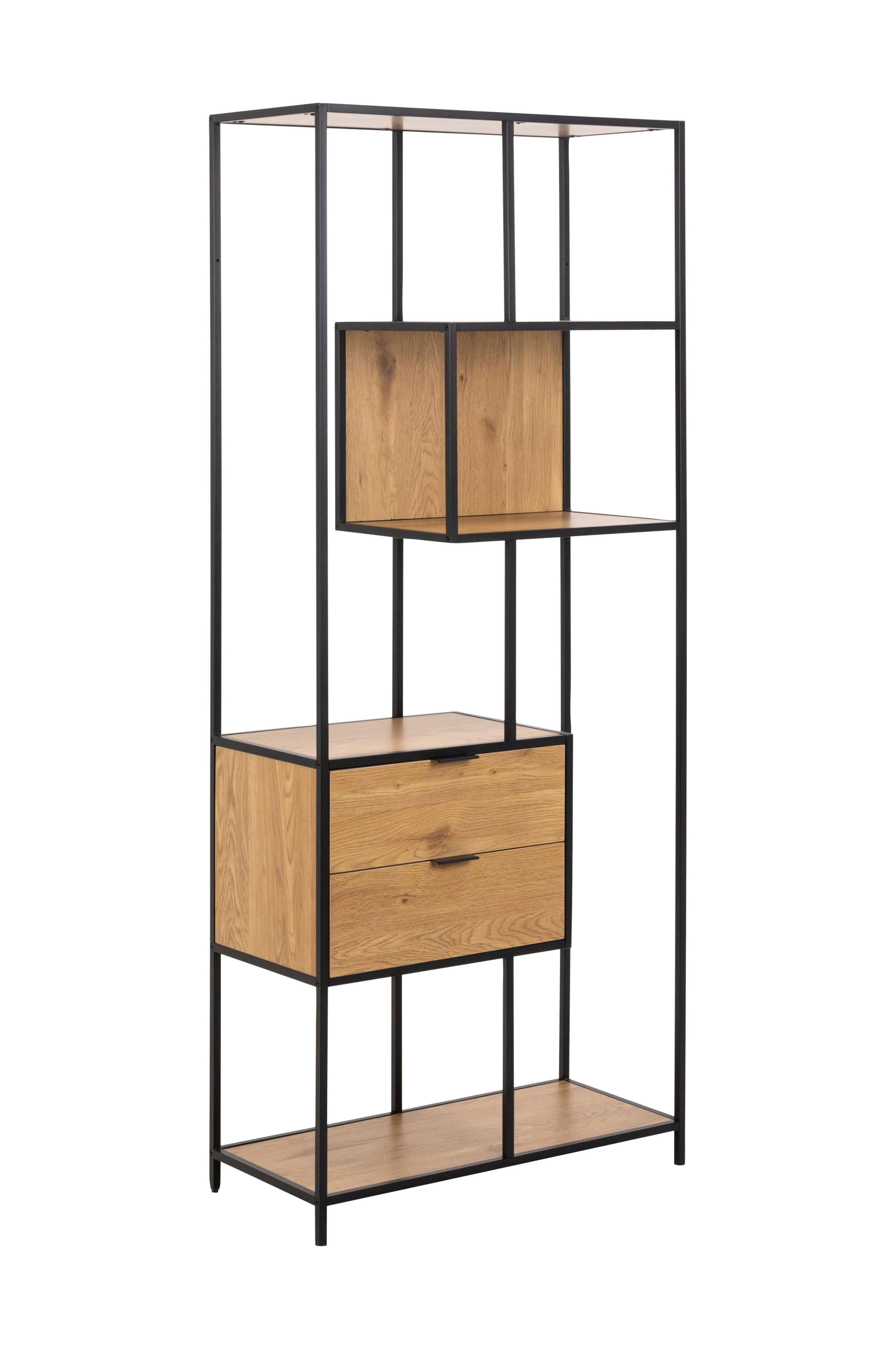 Bokhyllan är tillverkad med en ram av stål och är visuellt tilltalande tack vare kombinationen av färger, asymmetriska detaljer och den vändbara bakpanelen. Med 2 lådor och 4 hyllplan i vild ekdekor med lättskött yta är det den perfekta platsen att förvara böcker, spel och inredning som förtjänar att visas upp.