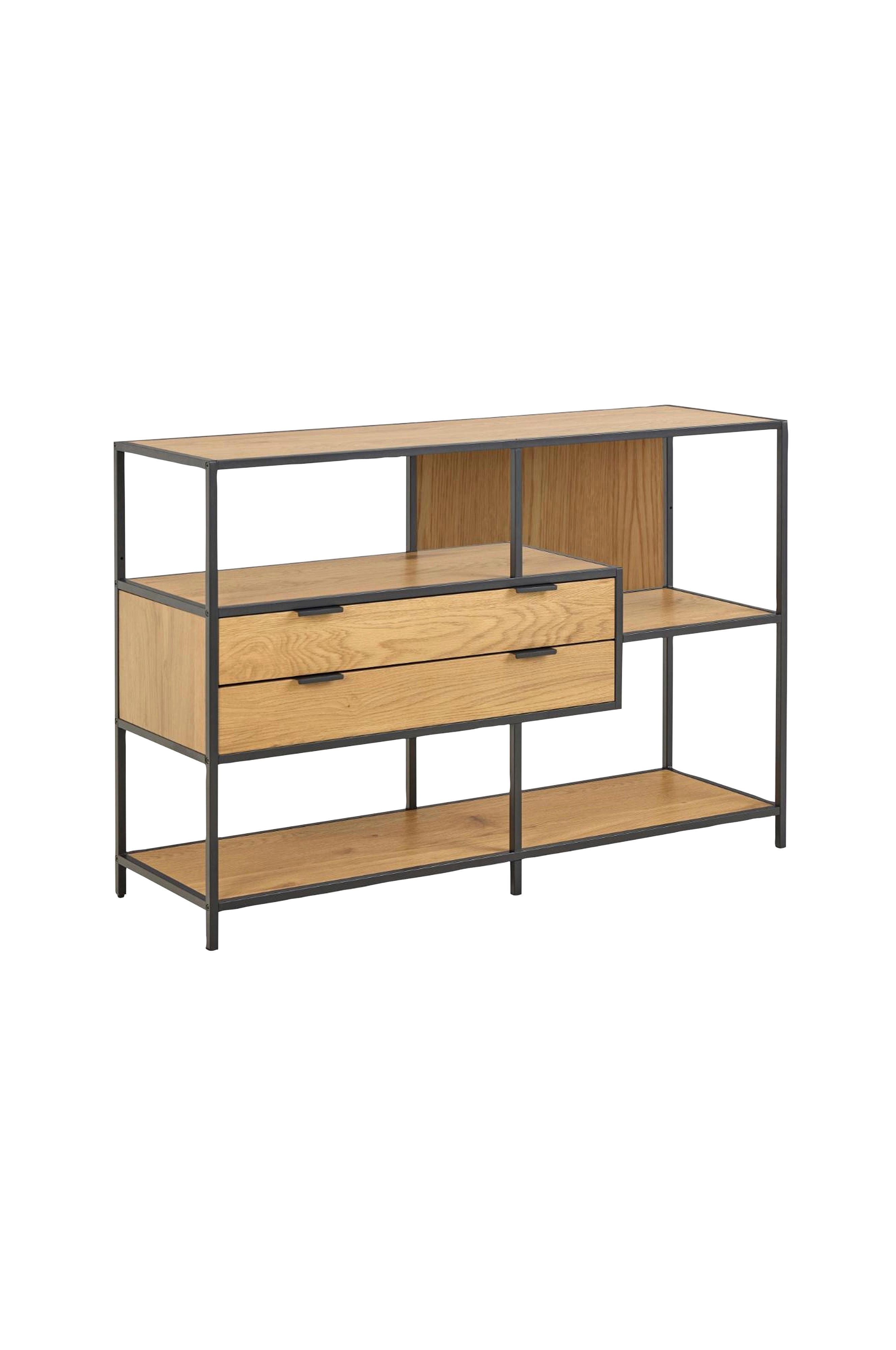 Bokhyllan har en ram av stål och är visuellt tilltalande tack vare den lugna färgen och de asymmetriska detaljerna. Med en vändbar bakpanel, 2 lådor och 3 hyllplan med lättskött yta är det den perfekta platsen att förvara böcker, spel och inredning som förtjänar att visas upp.
