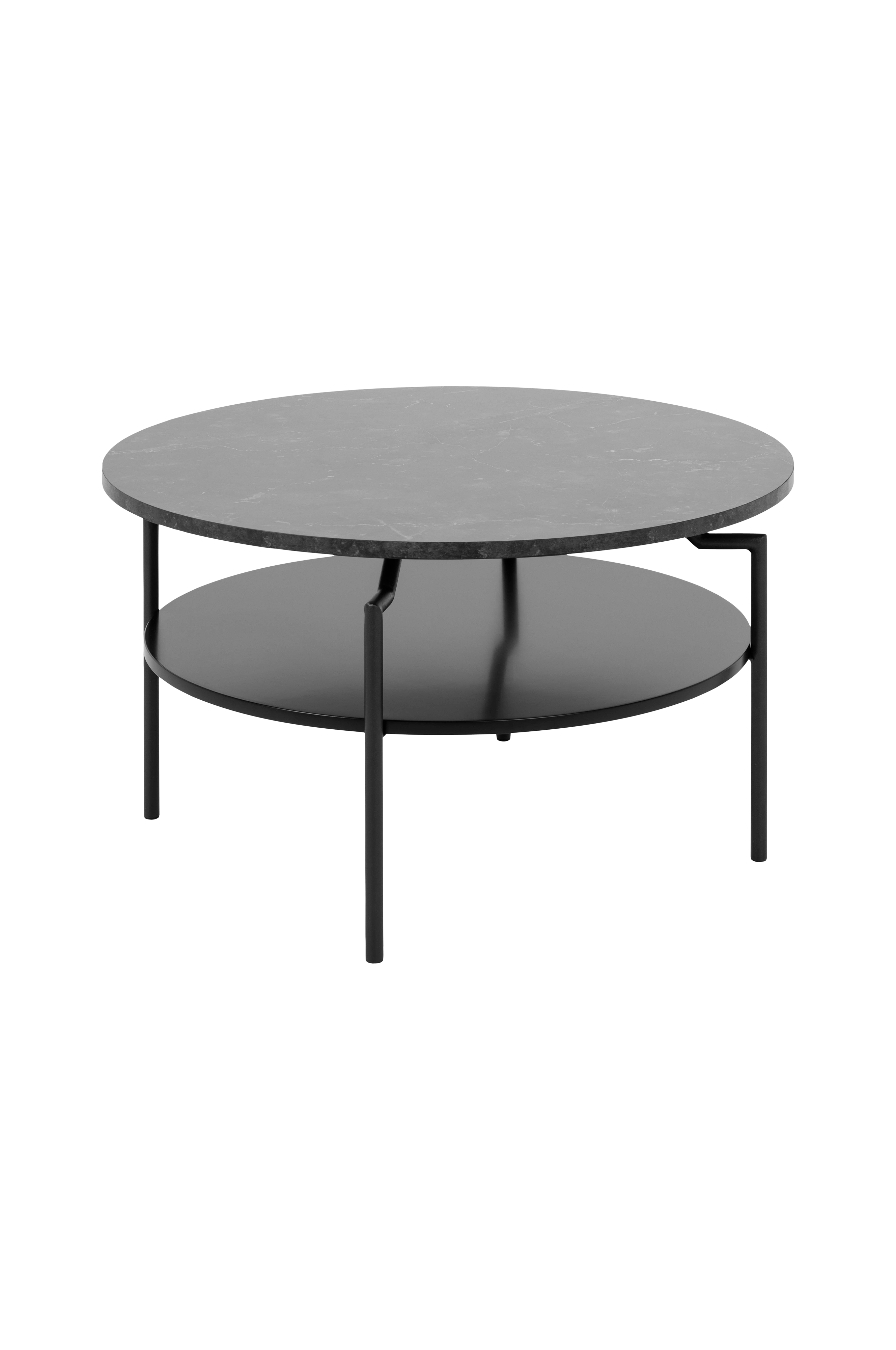 Soffbord av melamin med hylla. Stomme av pulverlackad matt metall. Mått; Diameter 80, höjd 45 cm. Levereras omonterat.