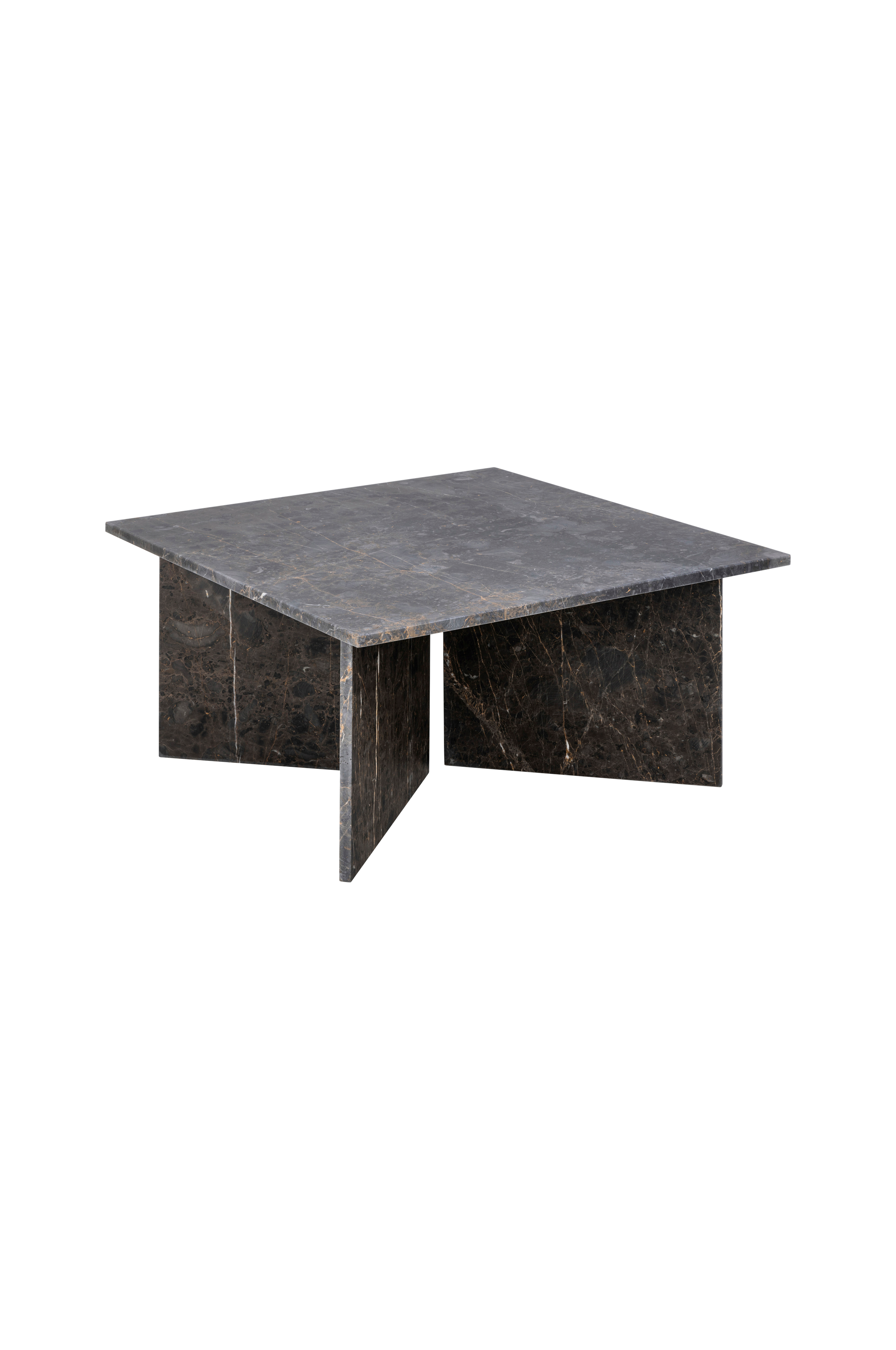 Soffbord Vega har en kvadratisk bordsskiva och V-formad stomme. Tillverkad av marmor med ljus ådring. Varje produkt är unik då stenen varierar naturligt i färg, struktur och yta.