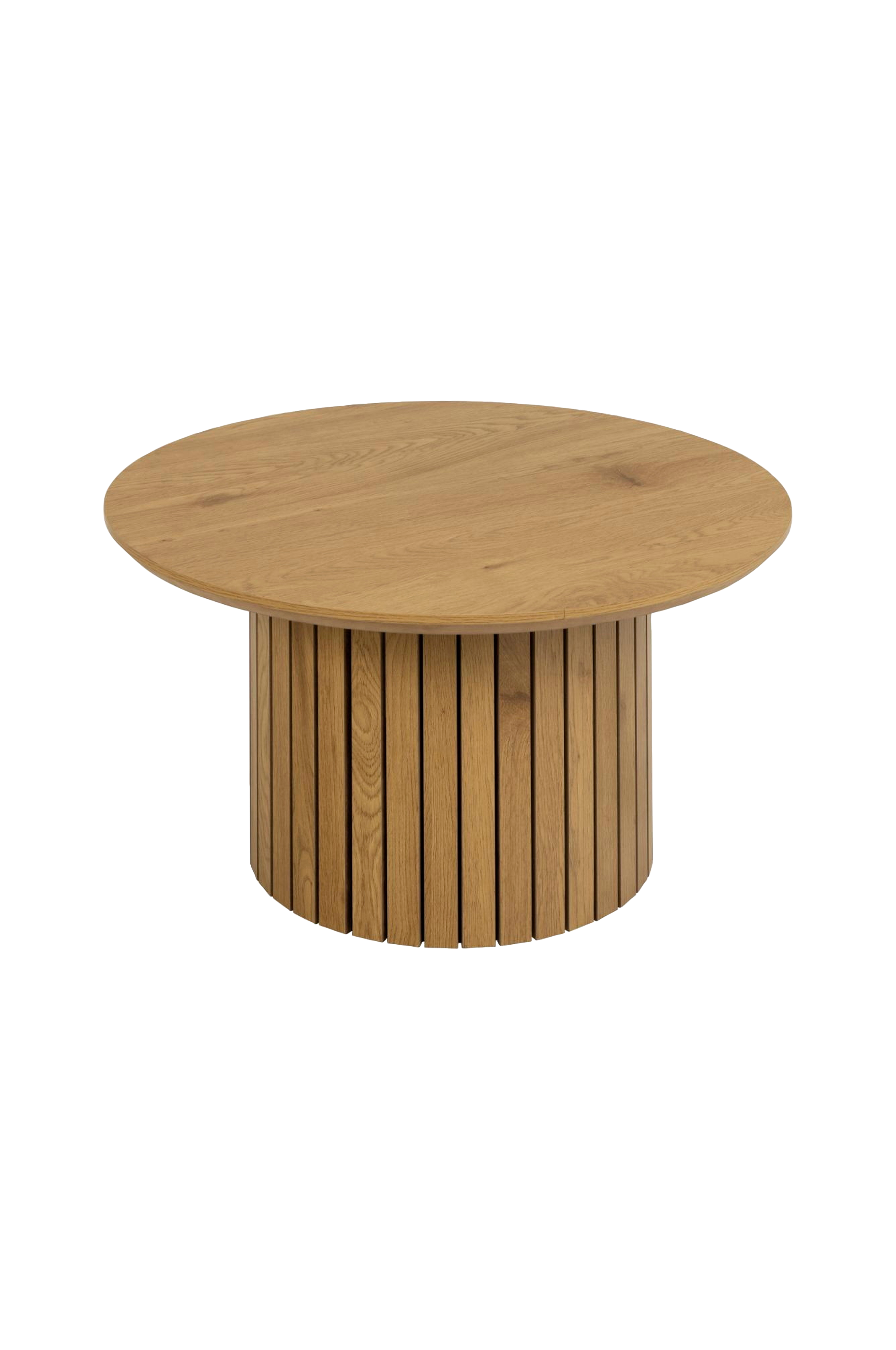 Omfamna skandinavisk design och njut av den naturliga känslan i detta soffbord. På den runda bordsskivan i vild ek-look finns det gott om plats för snacks och drycker. Den stöds av en rund lamellbas som ger designen ett elegant utseende. Underredet levereras i ett stycke men måste monteras, vilket är lätt att göra tack vare en enkel lösning.