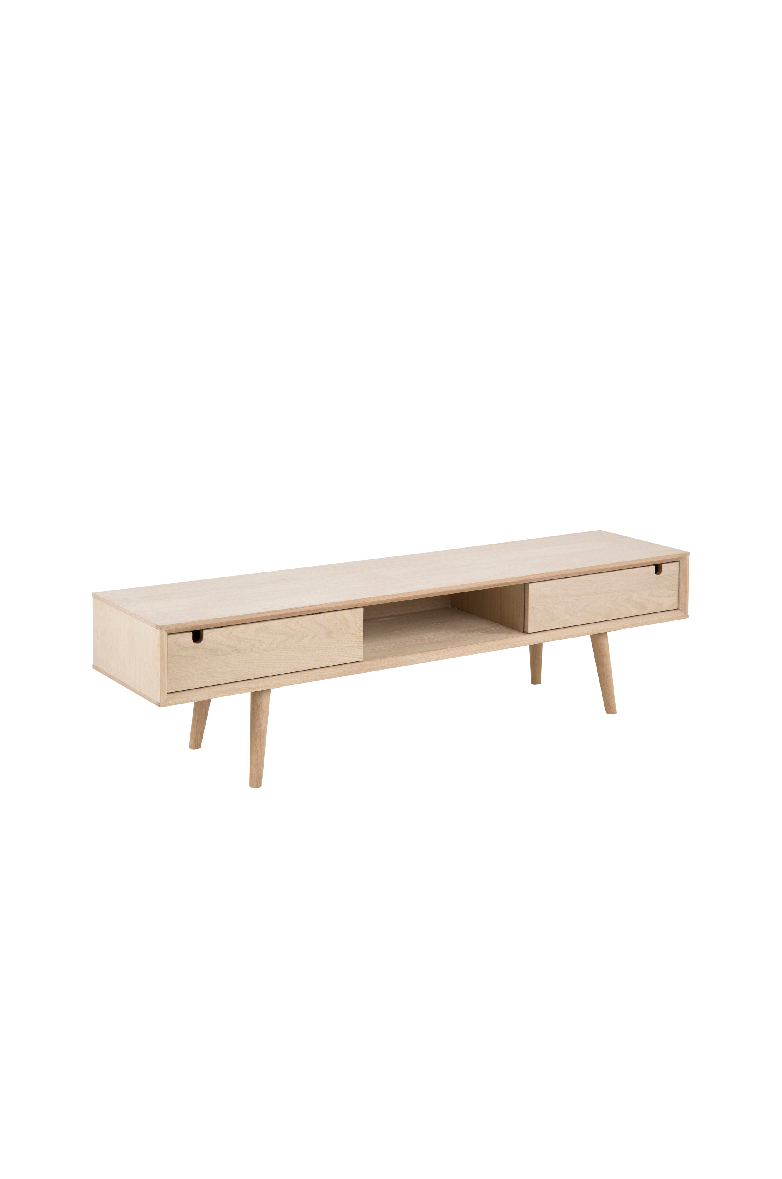 Tv-bänk. Vitpigmenterad ek faner. Hål för sladdar i ryggen. 160x38 cm, höjd 43 cm. Montera endast benen.