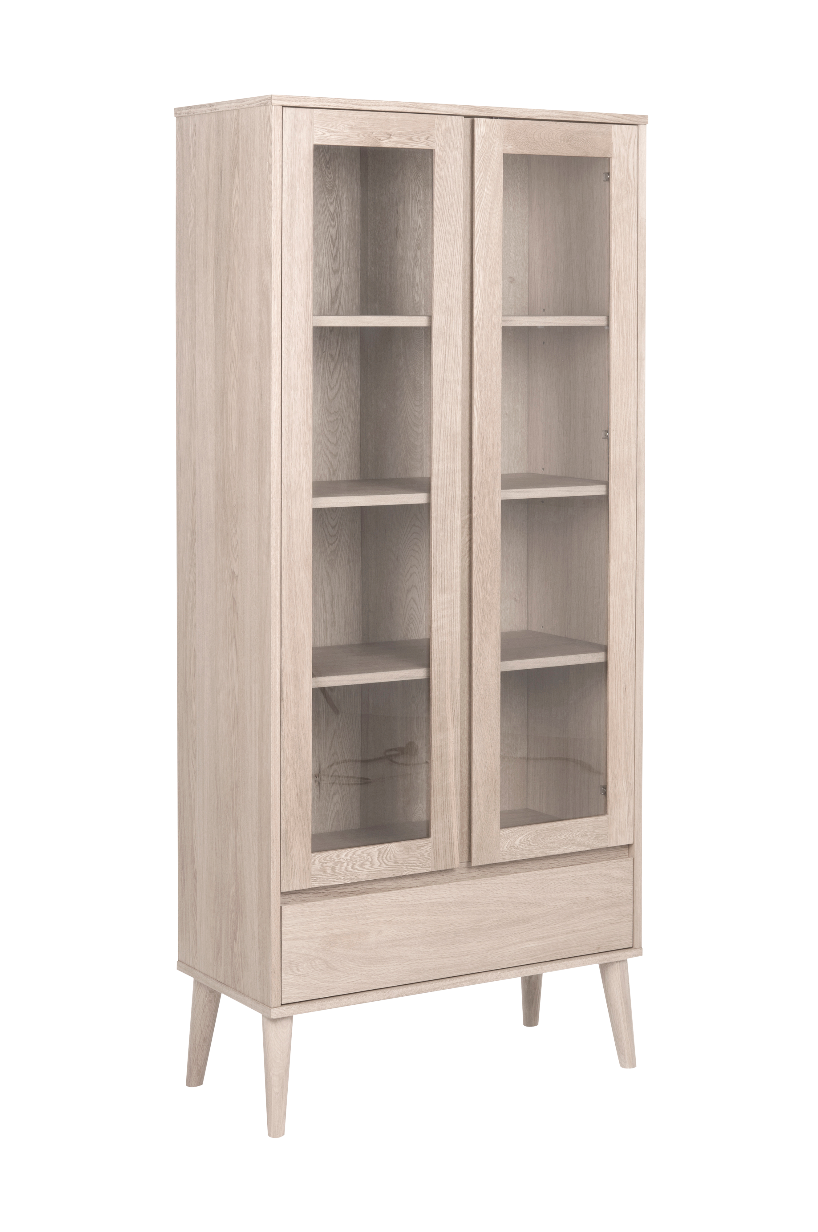 Vitrinskåp. Ek faner. 2 glasdörrar och 1 st låda. Bredd 80, djup 37, höjd 178 cm. Montera själv.