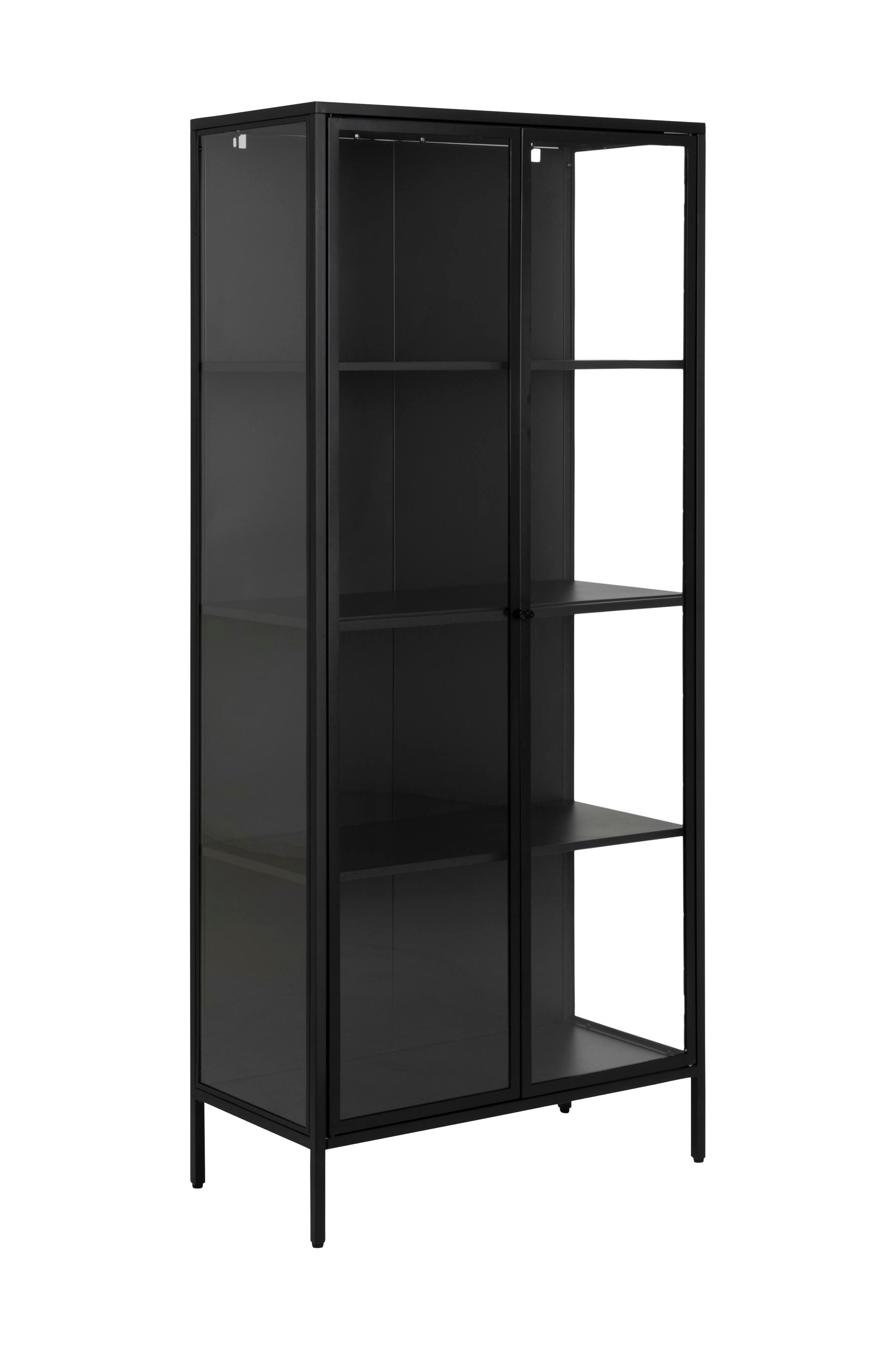 Ge ditt hem en industriell känsla med detta vitrinskåp av metall. Glasdörrarna ger rummet en modern känsla och den pulverlackerade metallen fullbordar den industriella stilen. Använd skåpet som ett coolt sätt att uppgradera ditt hem och samtidigt få bra förvaringsutrymme.