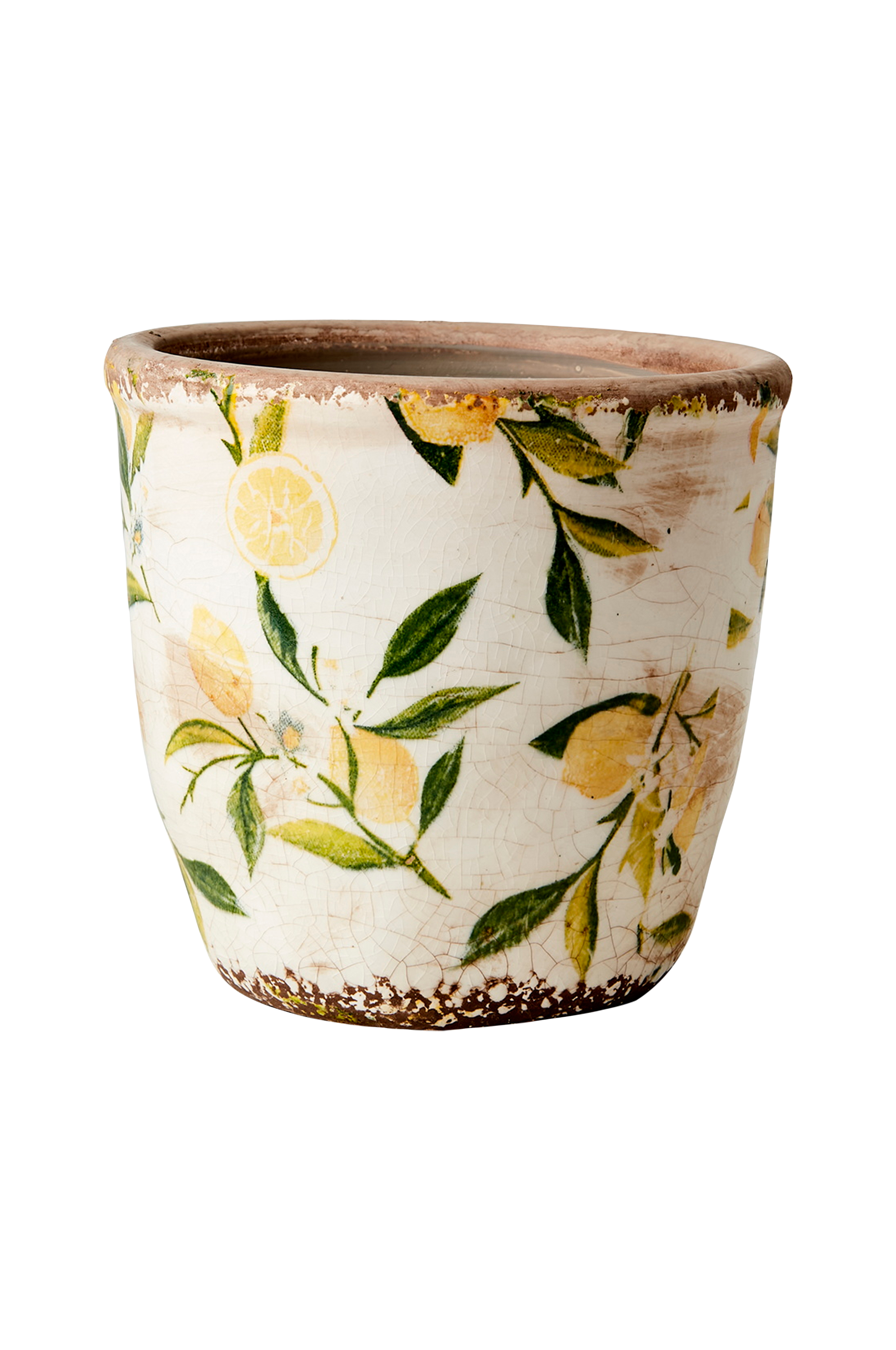 Vacker kruka med citronmönster. Poröst material, använd vattentät bricka för att undvika fläckar. Inre mått 12 cm.