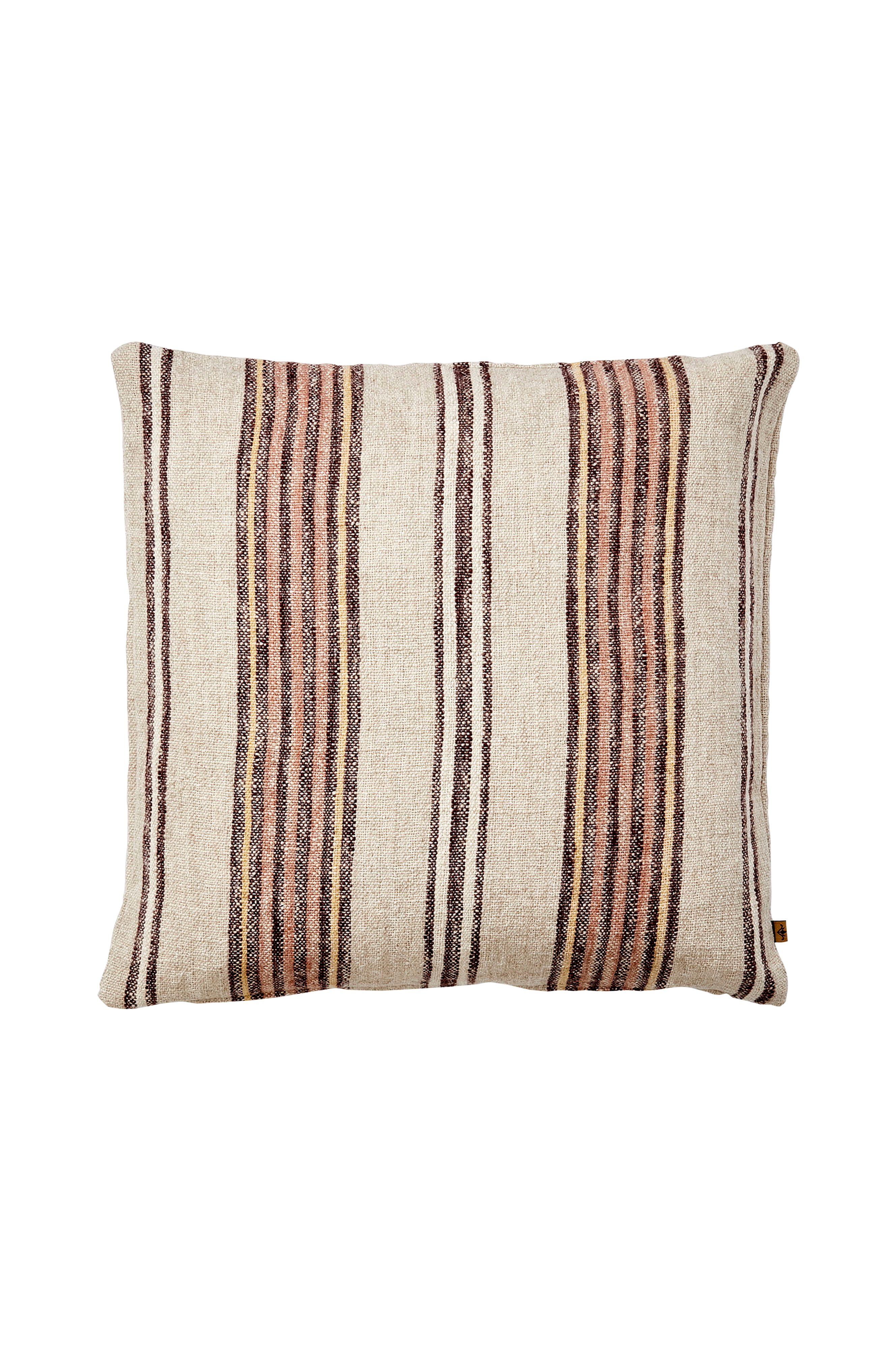 Snyggt randigt kuddfodral i en blandning av linne och bomull. Det har en rustik design med fransiga kanter och jordnära toner. maskintvätt 30°.