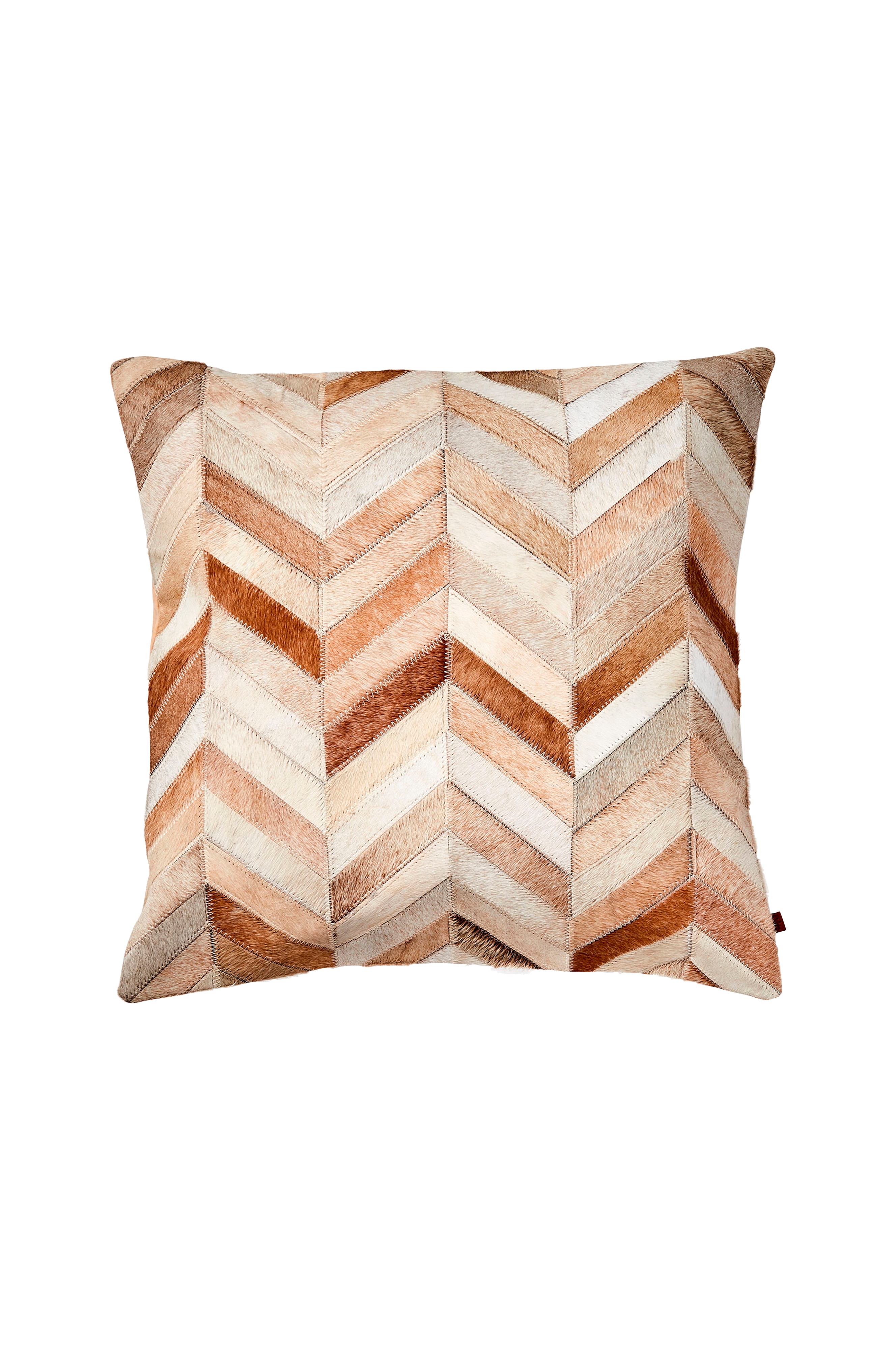 Kuddfodral sydda med patchworkteknik av spillbitar från naturlig kohud. Färgnyanserna varierar mellan överdrag med samma artikelnummer men mönstret är detsamma. Rengörs endast med fläckrengöring.