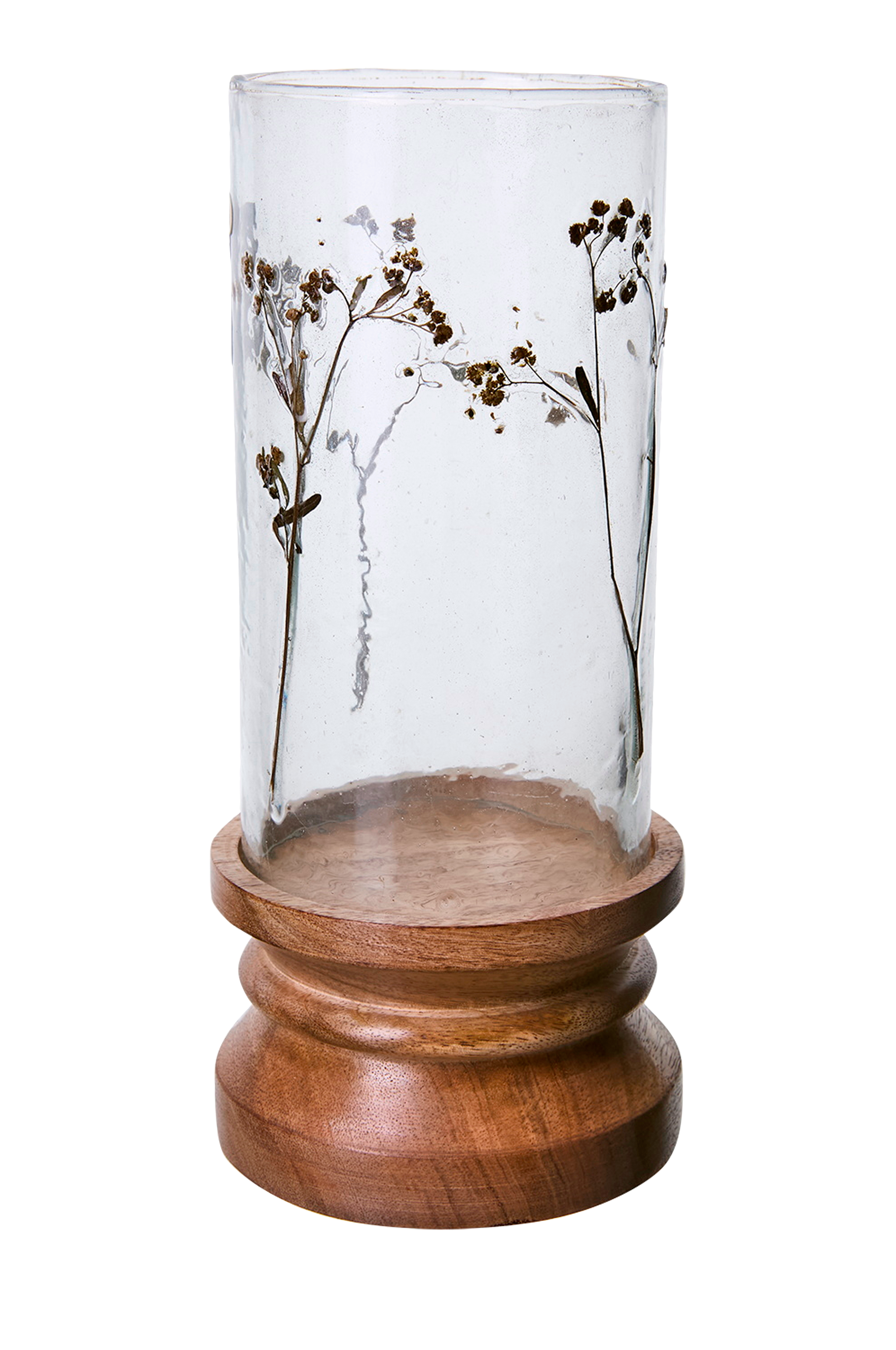 Ljusstaken leaf är en tidlös inredningsdetalj där klart glas möter graverade silhuetter av torkade växter. Ljuset reflekteras genom glaset, vilket framhäver de fina detaljerna och skapar en levande, naturinspirerad känsla i rummet. Den höga cylindriska formen ger en ren och luftig design, medan basen i mangoträ ger en varm och jordnära kontrast. Perfekt att placera på ett matbord, en skänk eller en fönsterbräda för att ge ditt rum ett mjukt och inbjudande sken.