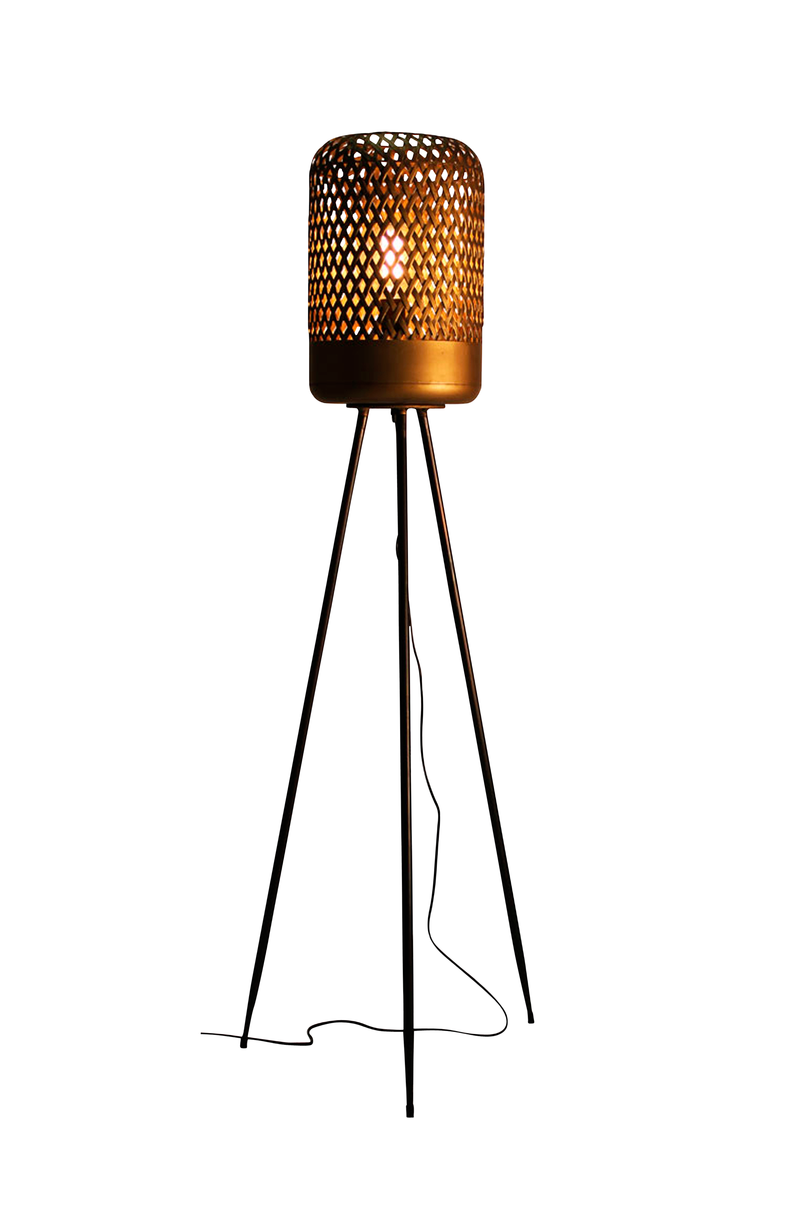 Golvlampa i guldfärgad metall med svarta ben. Bredd ca 41 cm. Djup ca 38 cm. Höjd ca 136 cm. Sladdlängd 240 cm. Stor sockel E 27. Max 40 W.