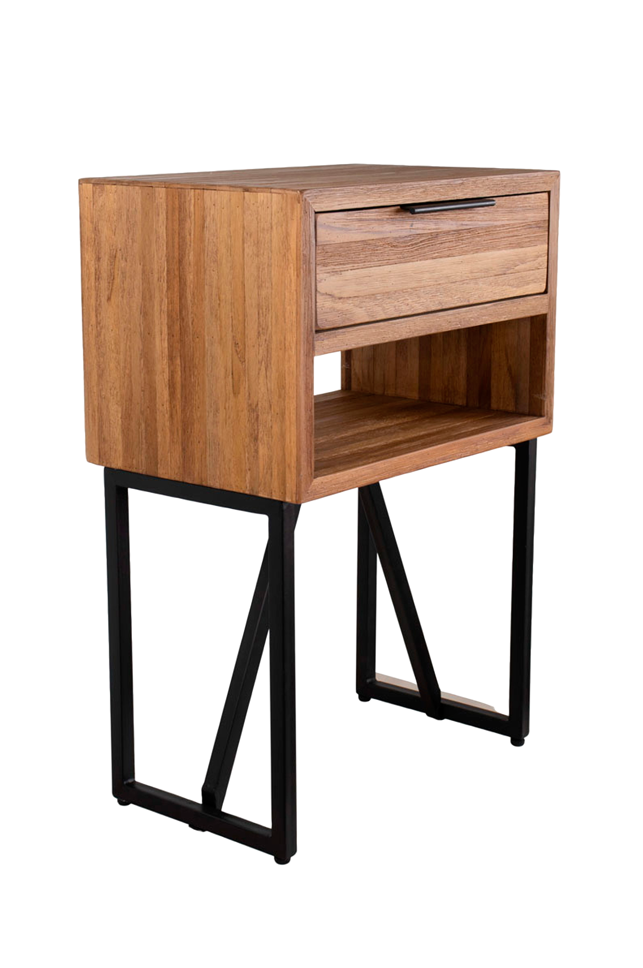 Utforska den naturliga skönheten och moderna kontrasten med vårt unika sängbord av teak. Med en karakteristisk färgton av ginger och elegant svart metallbenstomme blir detta sängbord en utmärkt inredningsdetalj som kombinerar rustik charm med samtida stil.material: järn och teak