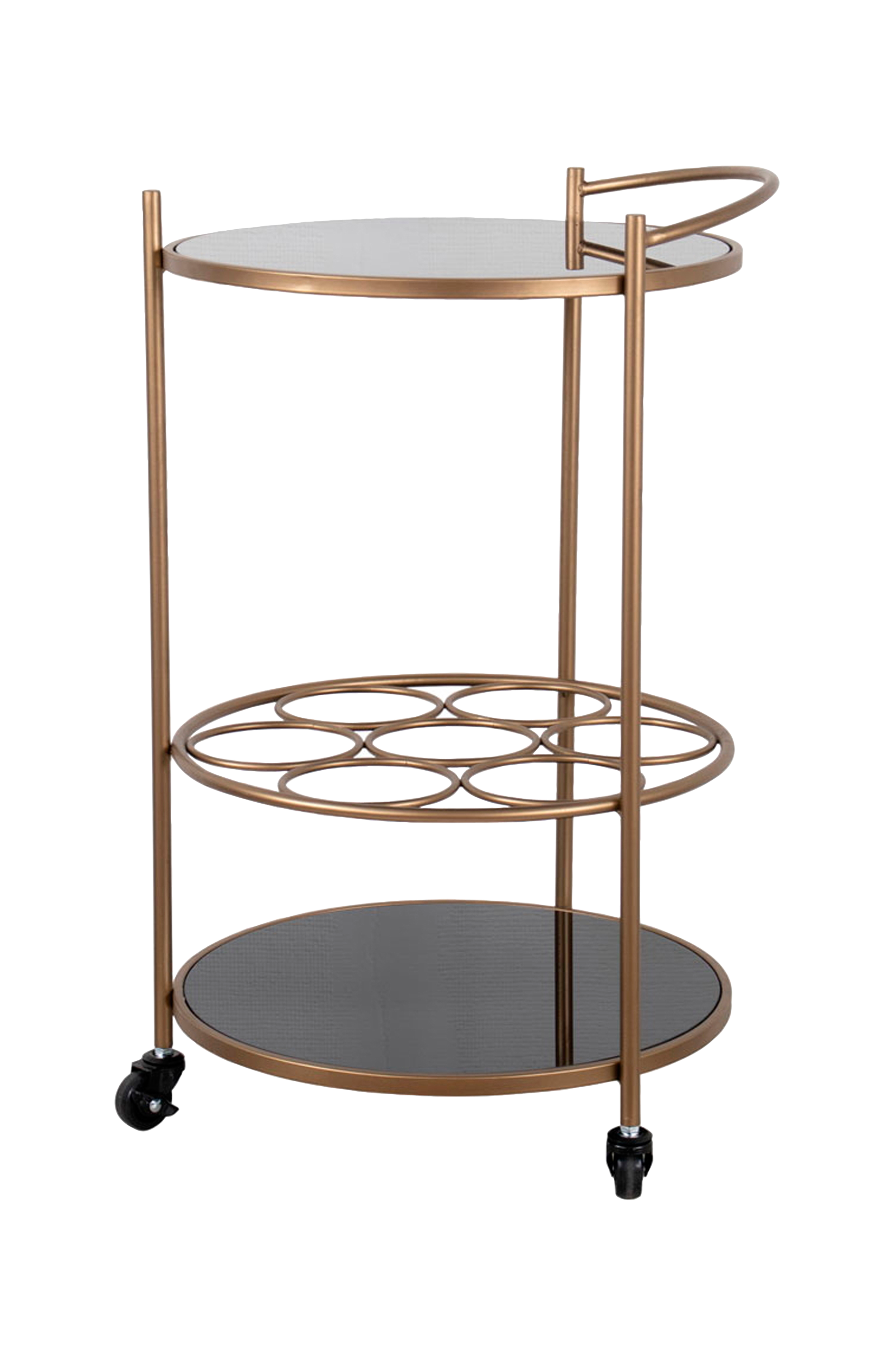Utforska lyxen av elegans och funktionalitet med vår förföriska serveringsvagn i guldfärgad metall och svartmålat glas. Denna enastående vagn är inte bara ett praktiskt verktyg för att servera dina favoritdrycker och läckerheter, den är också en visuell skatt som kommer att höja din serveringsupplevelse till en ny nivå av glamour. Det eleganta stället för sju flaskor är en imponerande funktion som både är praktisk och dekorativ. Det ger en säker plats för dina flaskor samtidigt som de blir en del av den visuella estetiken och skapar en fascinerande interaktion mellan färg och material. Material: järn och glas