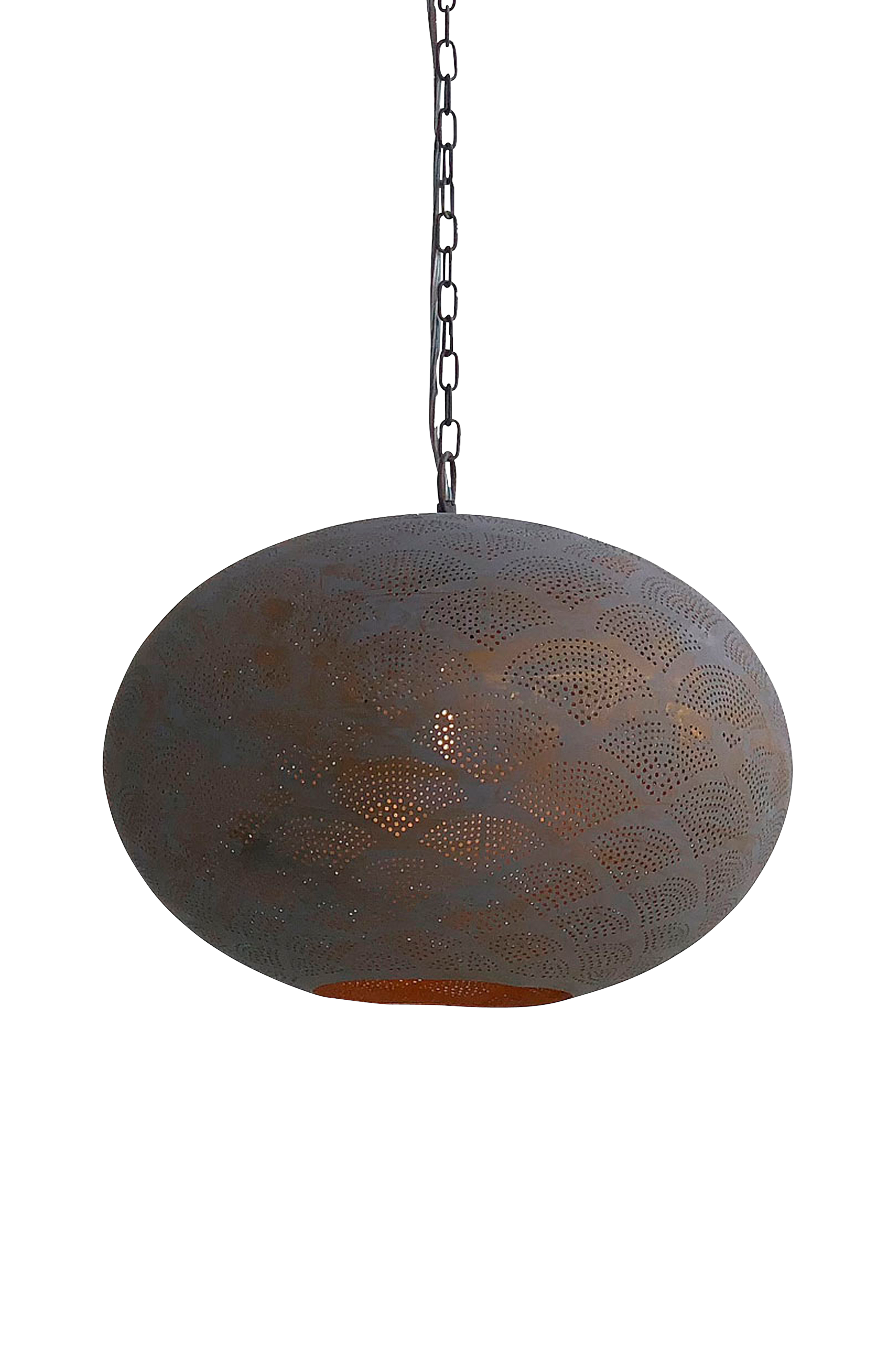 Taklampa i metall. Tak kopp med fäste för takkrok. Gråfärgad. Diameter ca 41 cm. höjd ca 33 cm. Stor sockel E 27. Max 40 W.