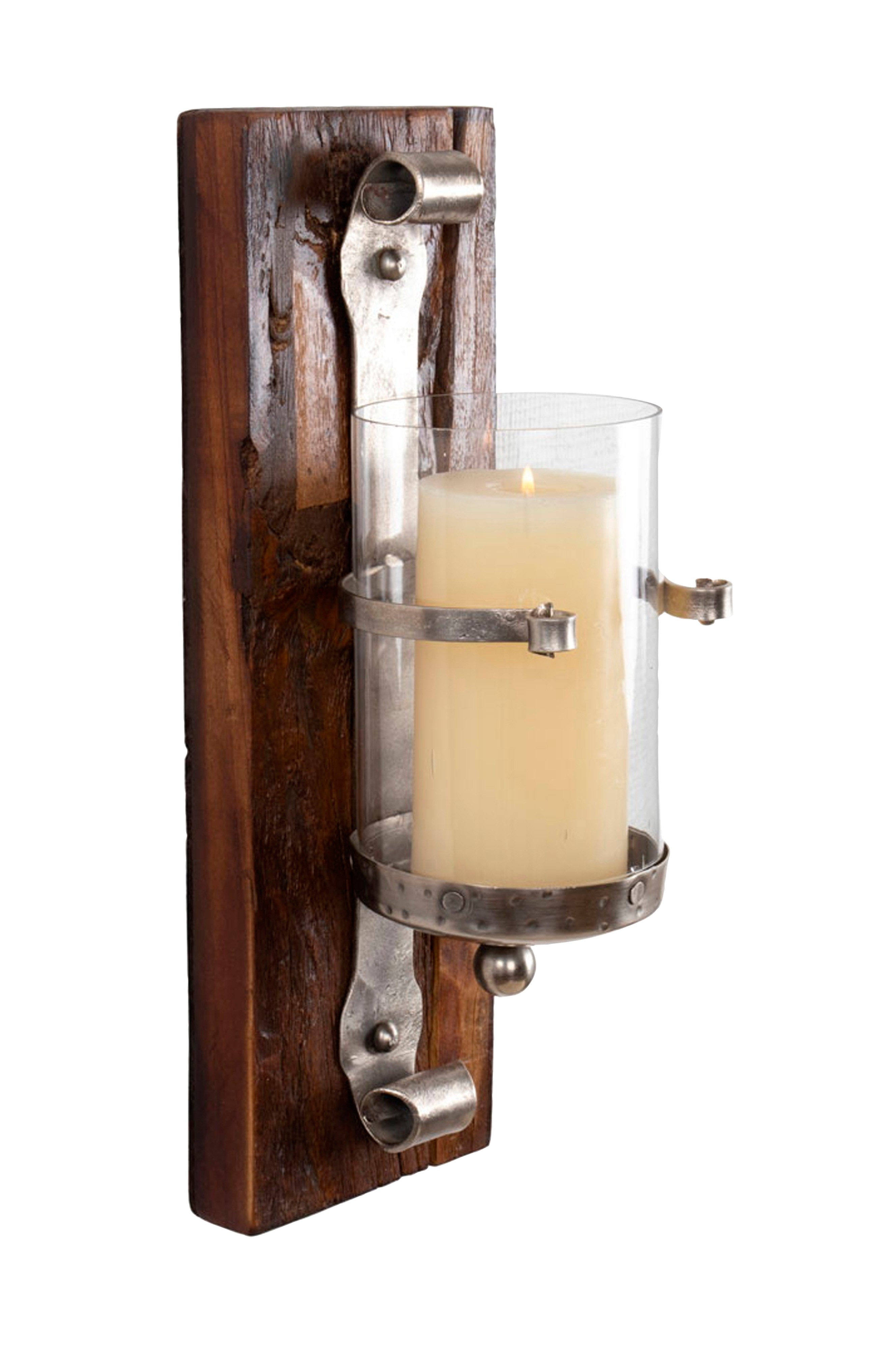 Väggljuslykta i trä med ljushållare i järn och kupa av glas.