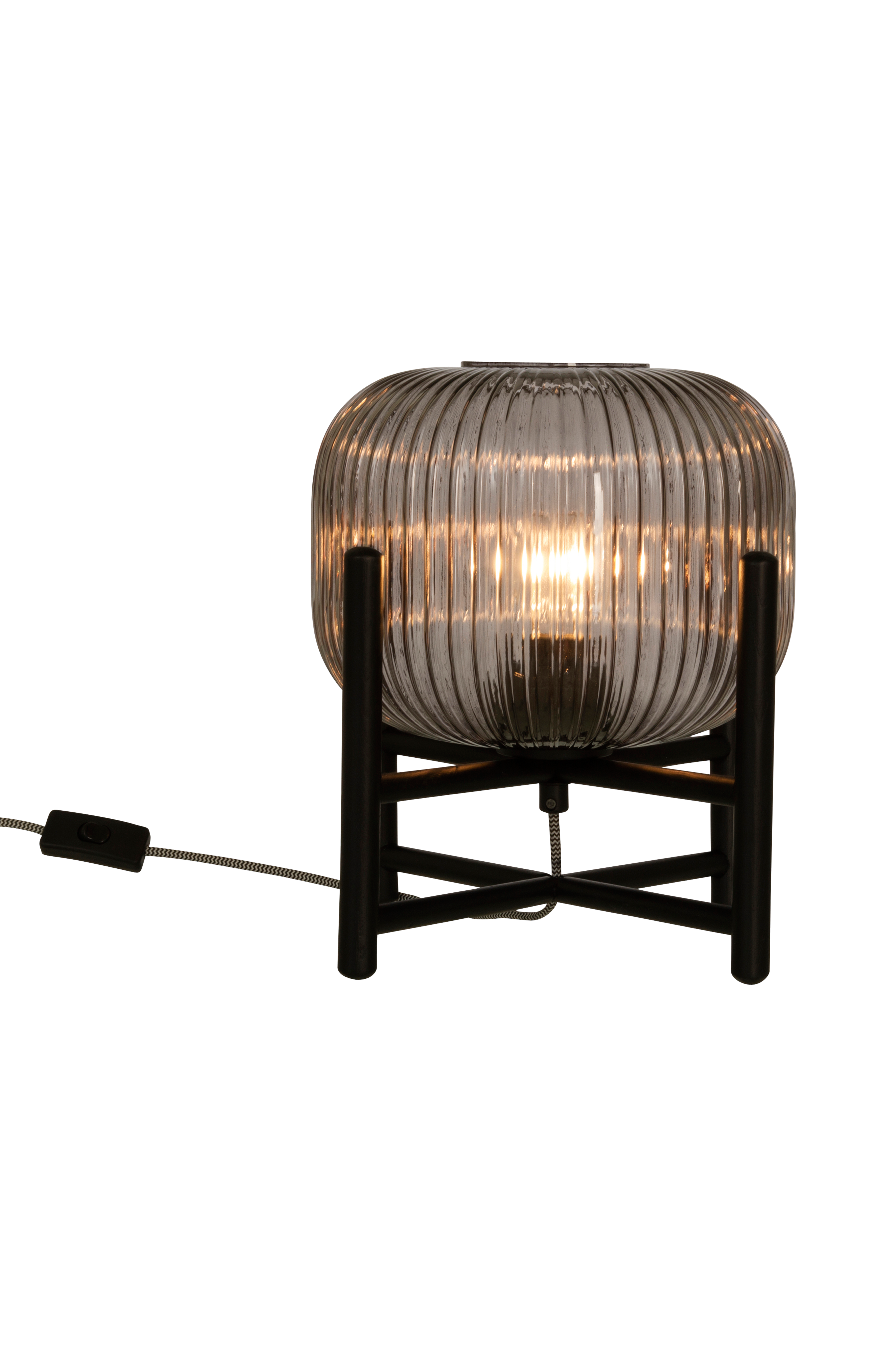VINDA bordslampa i skandinavisk design med nyans av opalfärgat glas och träfot. Ljuskontakt är på kabeln