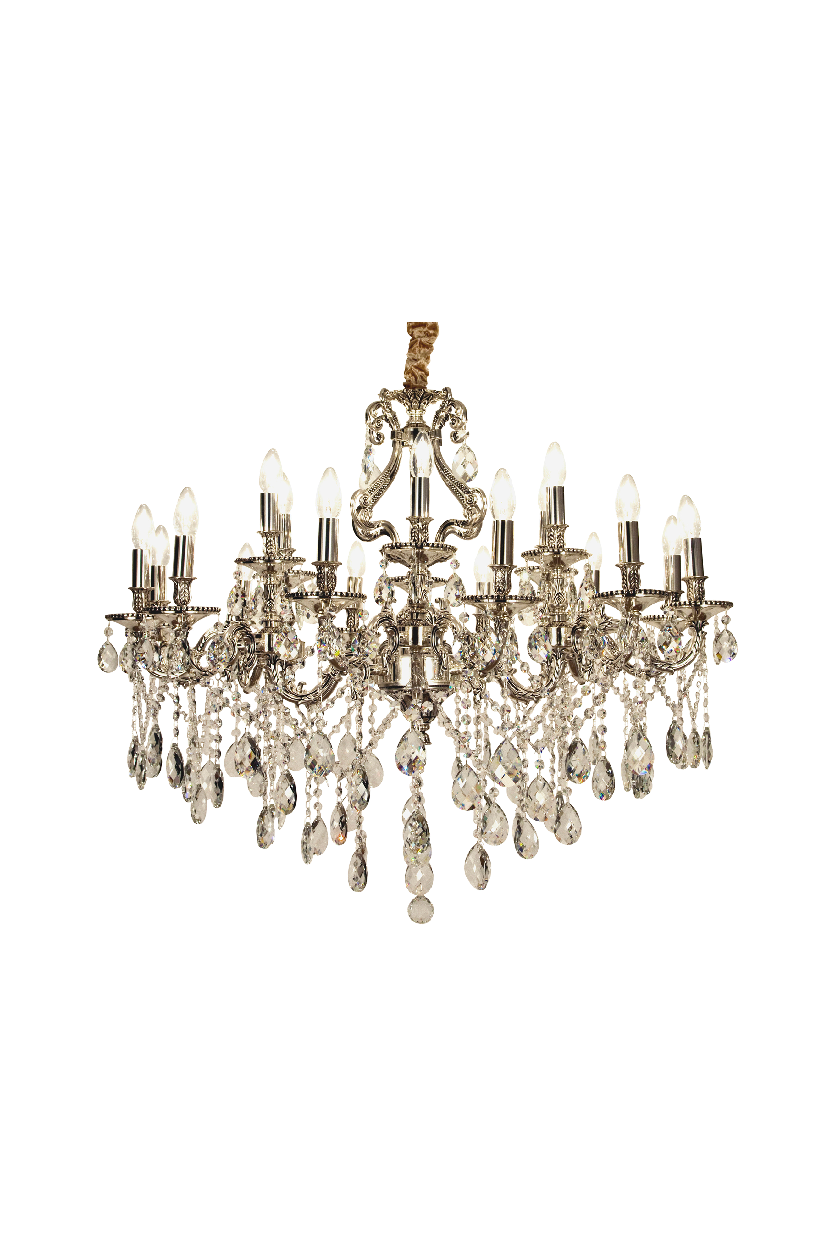 WINDSOR-ljuskrona, silver. Klassisk lampa av hög kvalitet med äkta K9-kristallprismor. Den levereras med beige textilstrumpor över kedjan. Material: metall- och K9-kristallprismor
