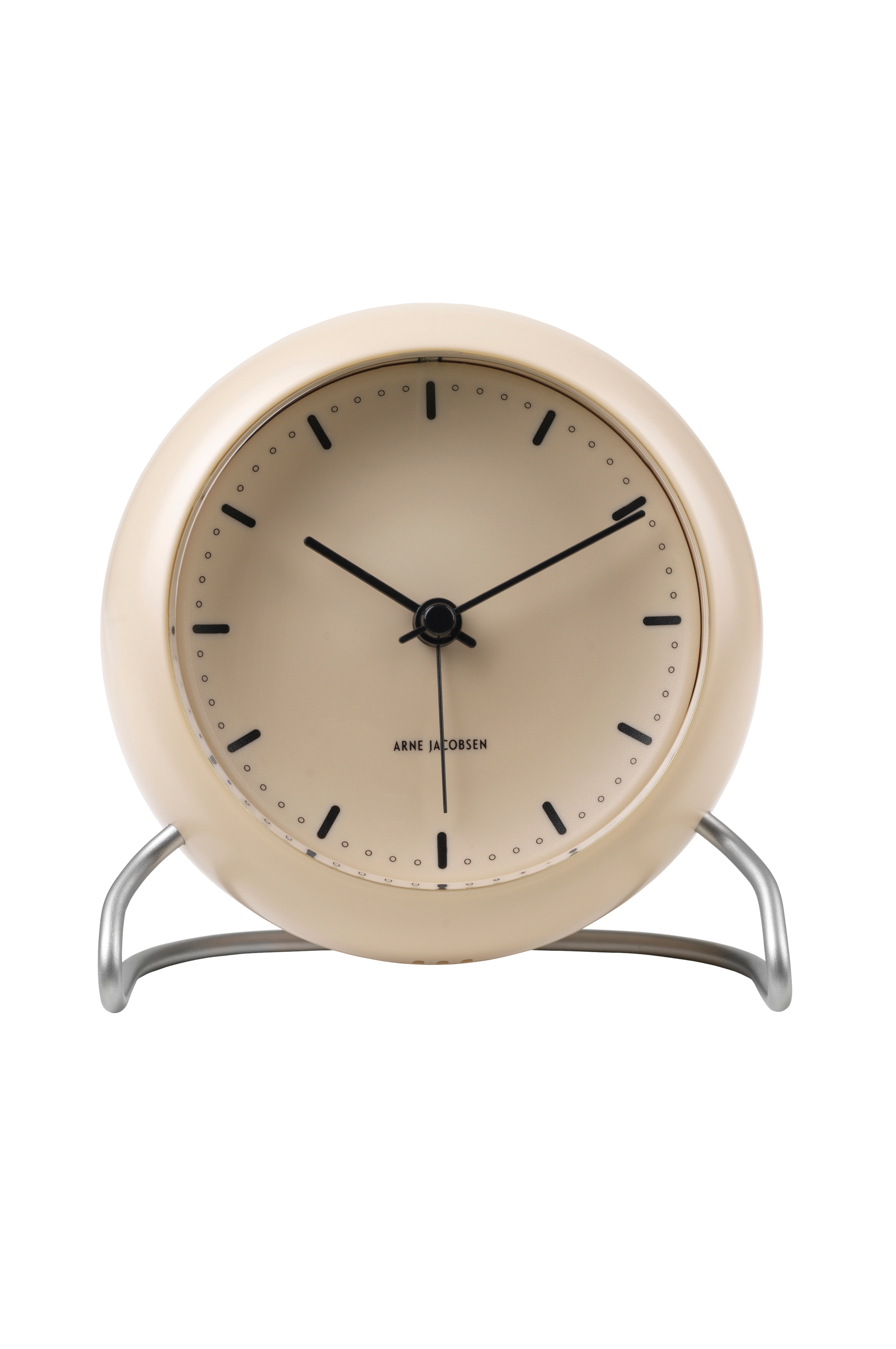 Arne Jacobsens City Hall-klocka utformades ursprungligen för Rødovre Rådhus i 1956. City Hall-klockan är älskad för sitt universella uttryck, och därför var det självklart att skapa City Hall även som bordsur. Förutom att vara ett dekorativt inslag överallt i hemmet har klockan alla de nödvändiga funktionerna som alarm, snooze och belysning. Den har en sensor som gör att både belysning och snooze aktiveras med en lätt rörelse med handen över klockan. Här visas bordsuret i stone blue.