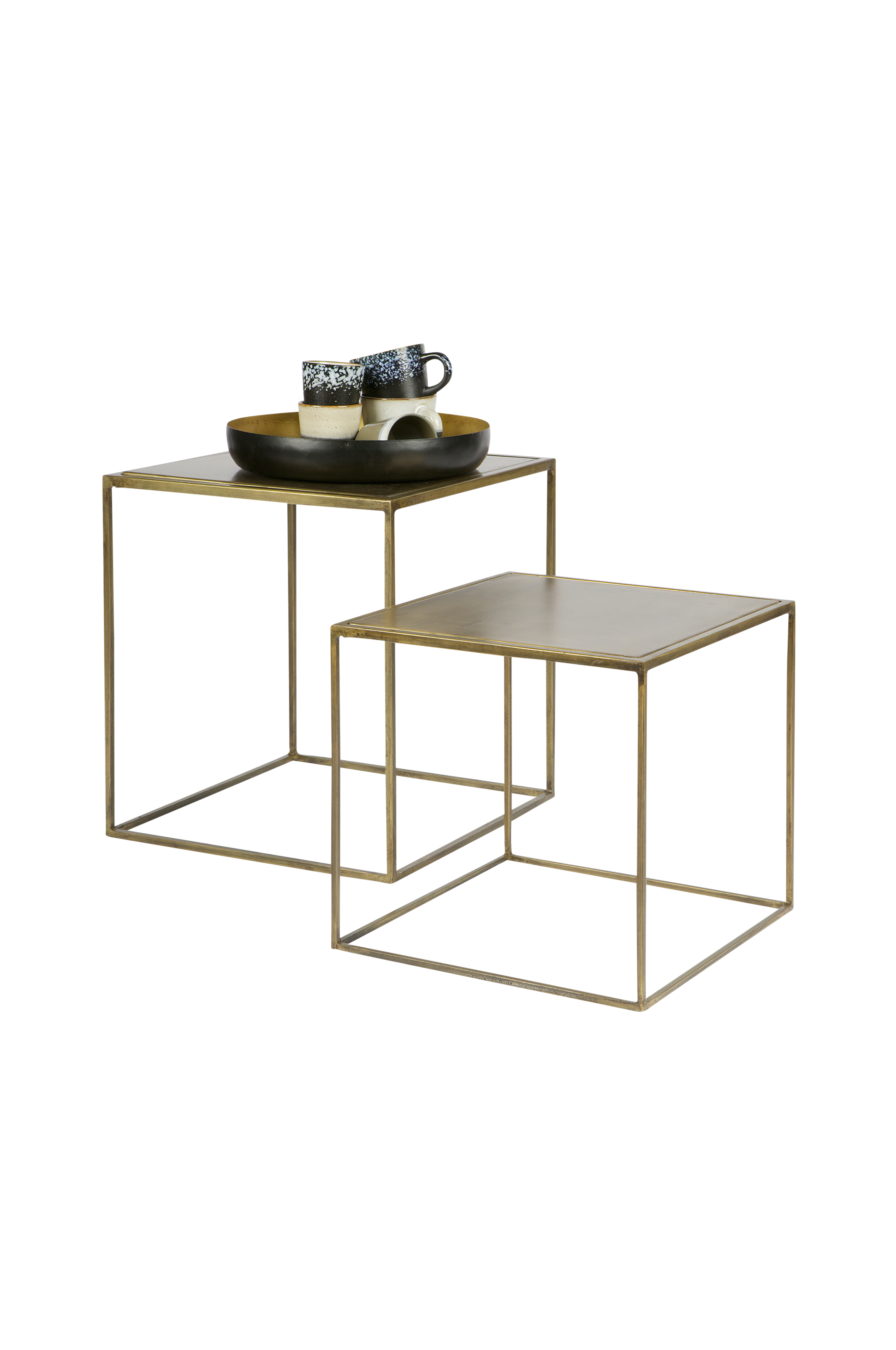 Uppsättningen 2 - Metallic sidebord i BePureHome-kollektionen är en riktig blickfång i din interiör. De två borden är gjorda av metall. Bordskivorna är färdiga i antikmässing. Storleken på det stora bordet är 45x40x40 cm och det lilla bordet 35x36x36 cm. På grund av bordets olika storlekar kan de enkelt sättas samman och kommer att bilda en vacker kombination.