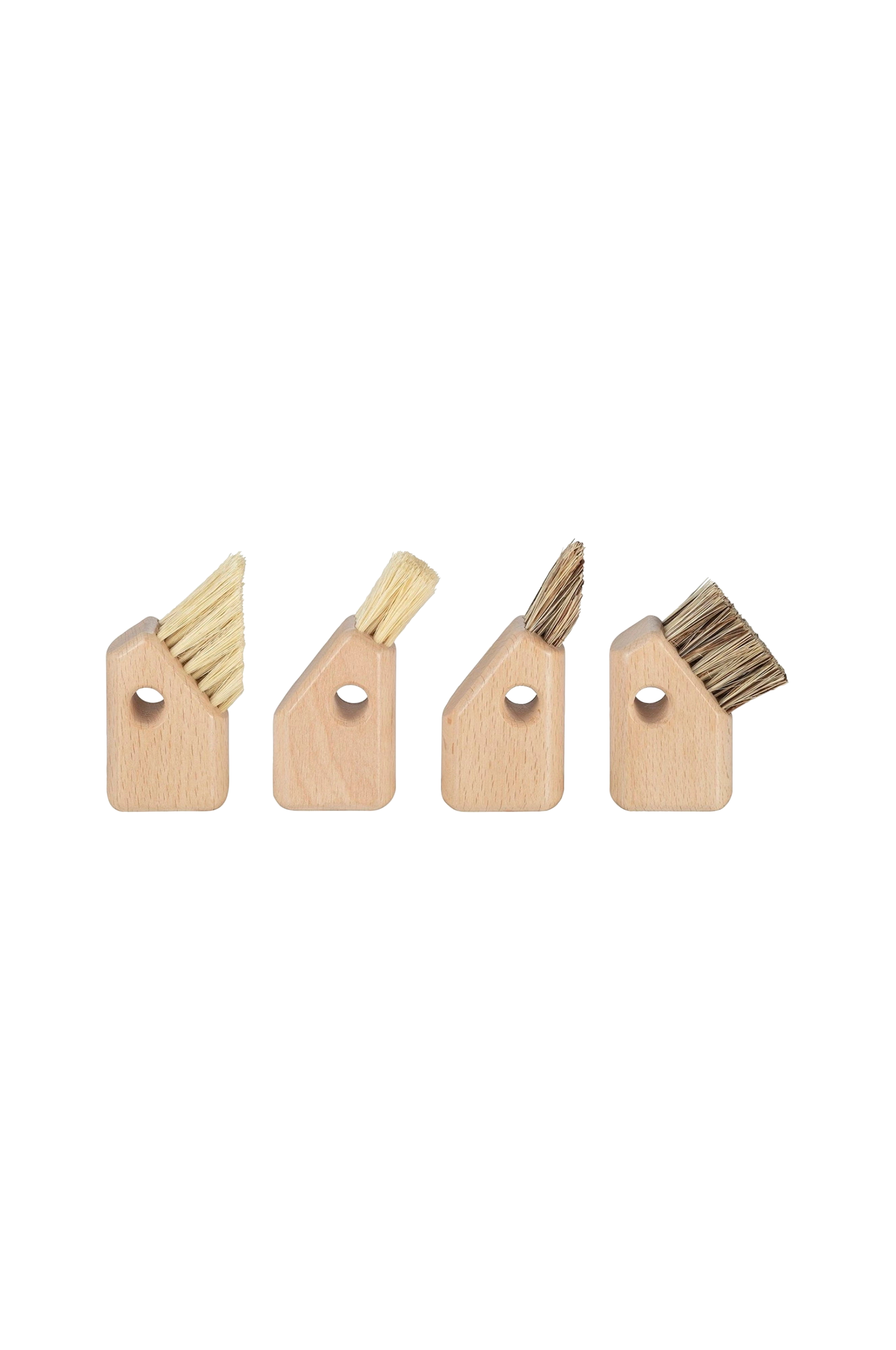 Fyra köksborstar i två olika hårdhetsgrader. Bland borstarna på aves hittar du en papegoja, en albatross, en anka och en svan som passar för olika användningsområden. Träet är tillverkat av bok och borstarna är också tillverkade av naturfibrer.