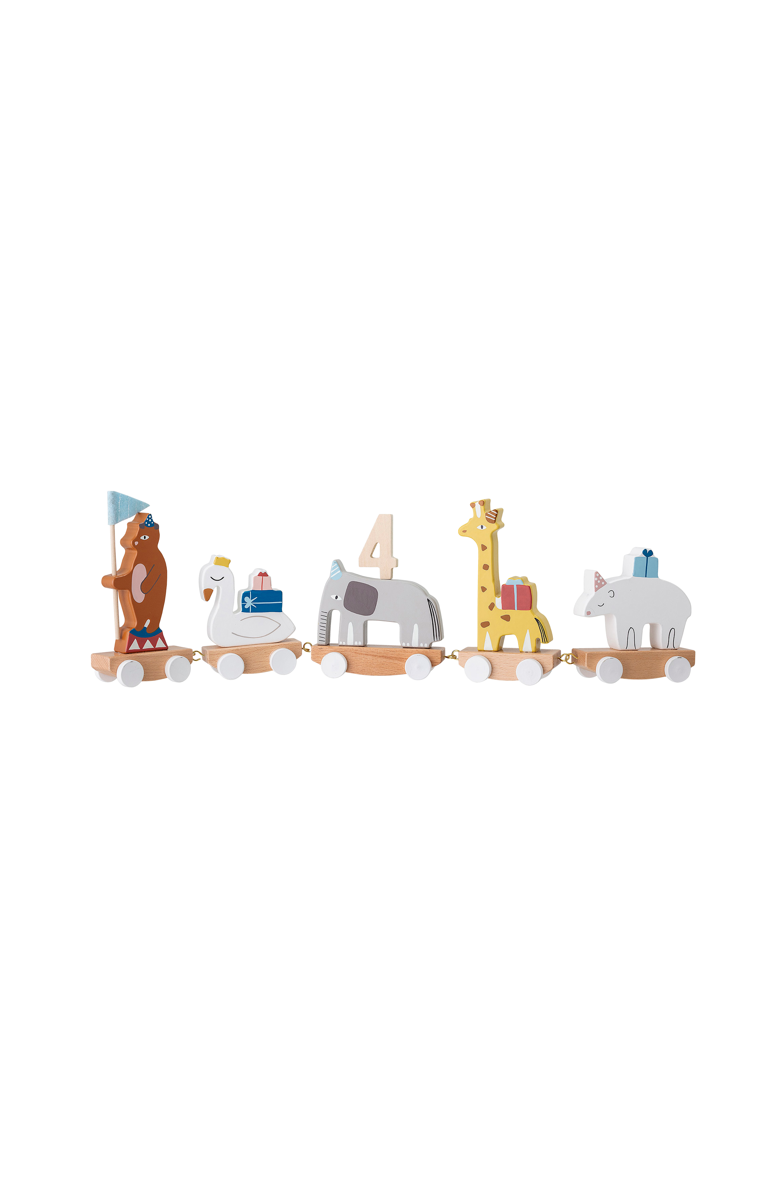 Morea födelsedagsdekoration från Bloomingville MINI är tillverkad av bok. Detta nya, söta födelsedagståg med djurtema är perfekt som bordsdekoration när vänner och familj kommer för att fira. Levereras i en presentförpackning, med siffror från 1 till 9.