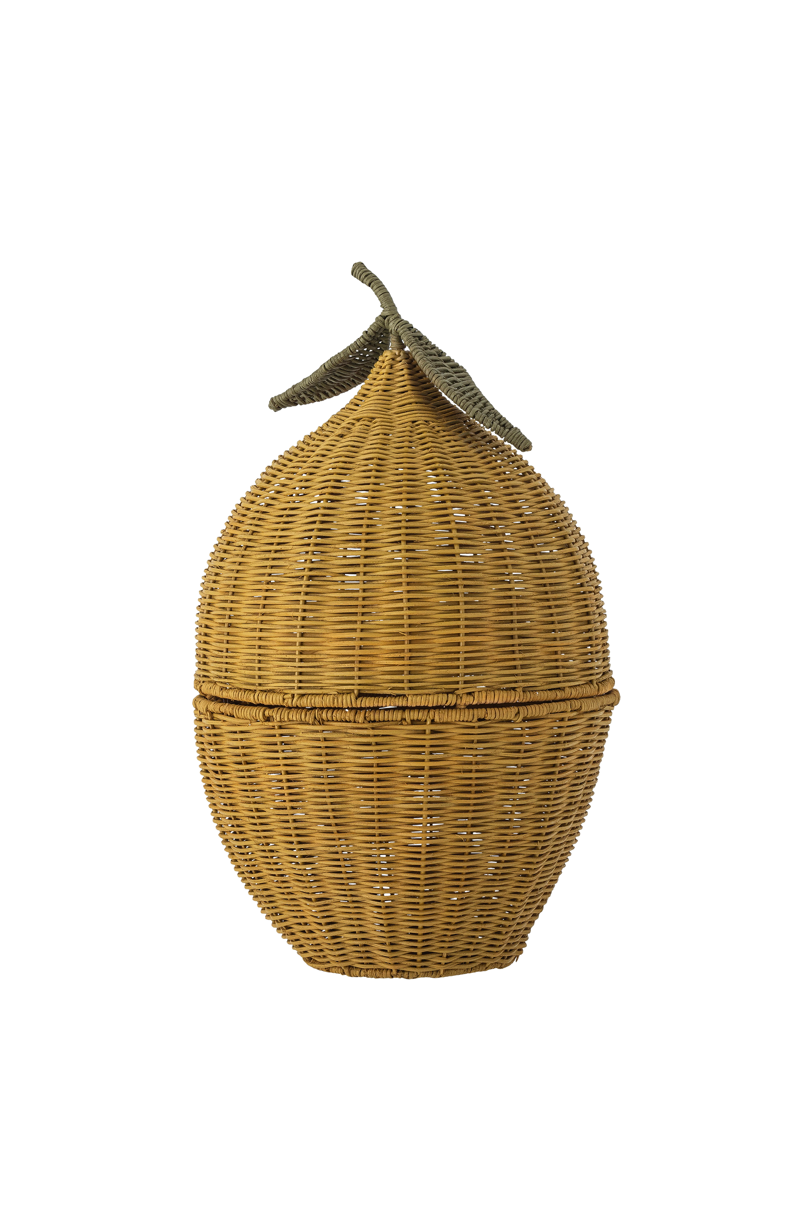 sage korg med lock från bloomingville mini har en mysig design som liknar en citron. Denna vackra och praktiska korg ger förvaringsutrymme för alla barnets favoritsaker och ger en lekfull och dekorativ touch till barnrummet. Locket är avtagbart, vilket gör det enkelt för små händer att komma åt nallar och leksaker, och att stoppa undan dem igen. Mått: d30xh50 cm