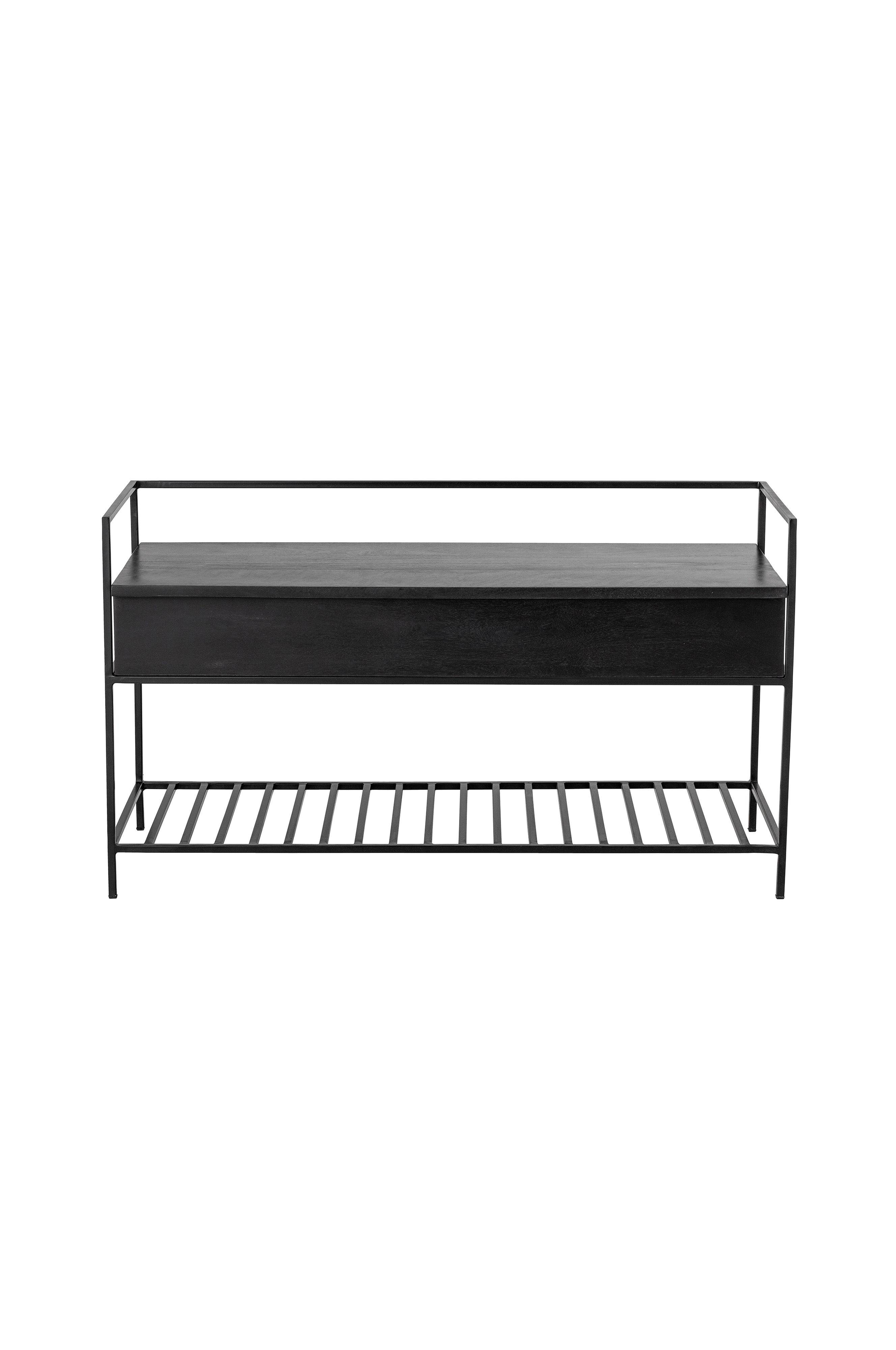 Bänk av metall och mangoträ. Förvaring i sitsen med soft close lock. Levereras monterad.