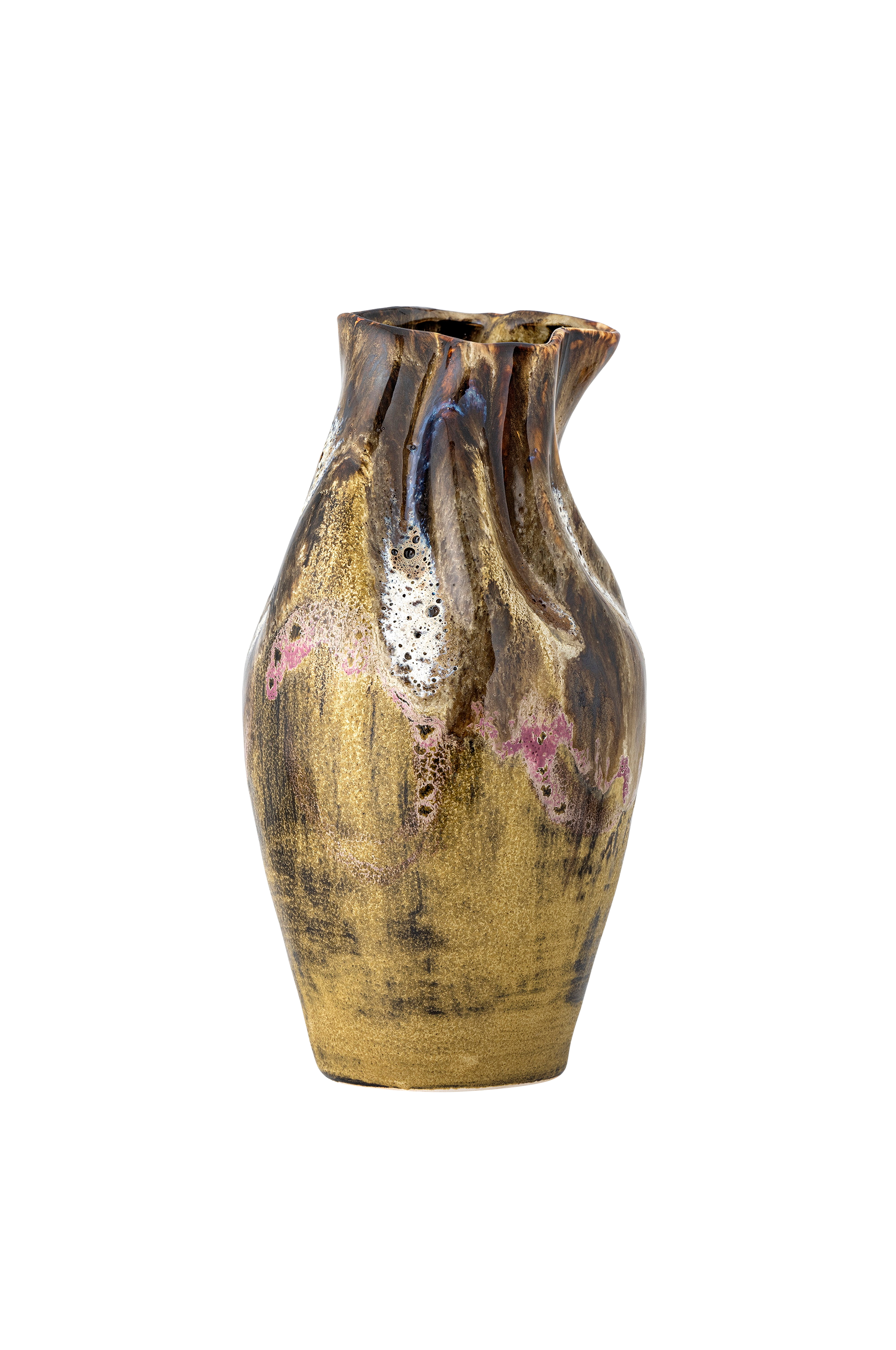Vasen benoit från bloomingville har en organisk form med en fascinerande glasyr i gult och brunt med sporadiska inslag av lila. De fina mönstren i glasyren ger vasen en distinkt och naturlig skönhet. Glasyren kan ge variationer i färgen, vilket gör varje vas helt unik. Mått: d13xh26 cm
