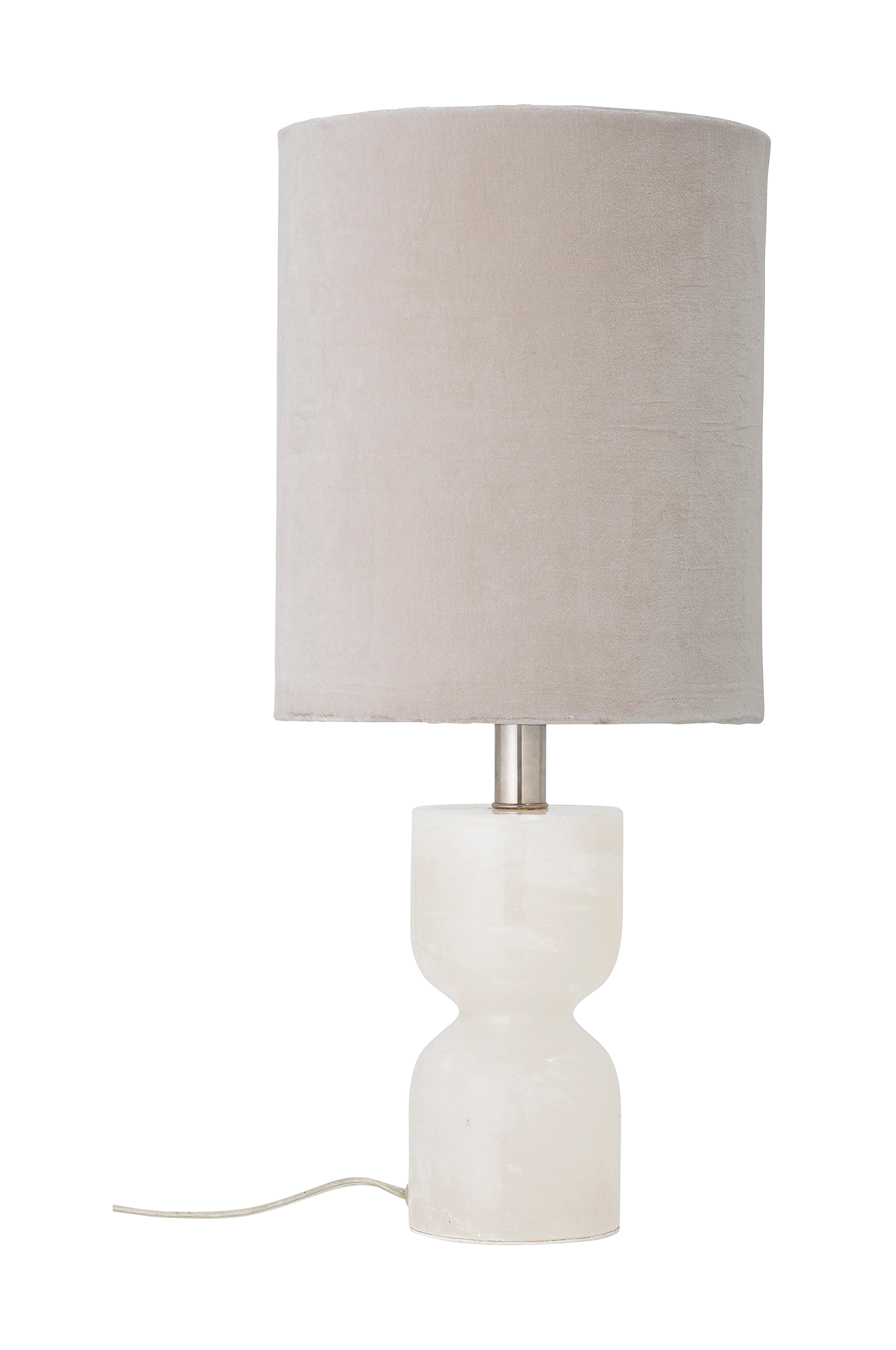 Bordslampa tillverkad av alabaster med en lampskärm av sammet. Alabaster har en opalliknande, halvtransparent färg som är mycket unik. Diameter 24 cm.