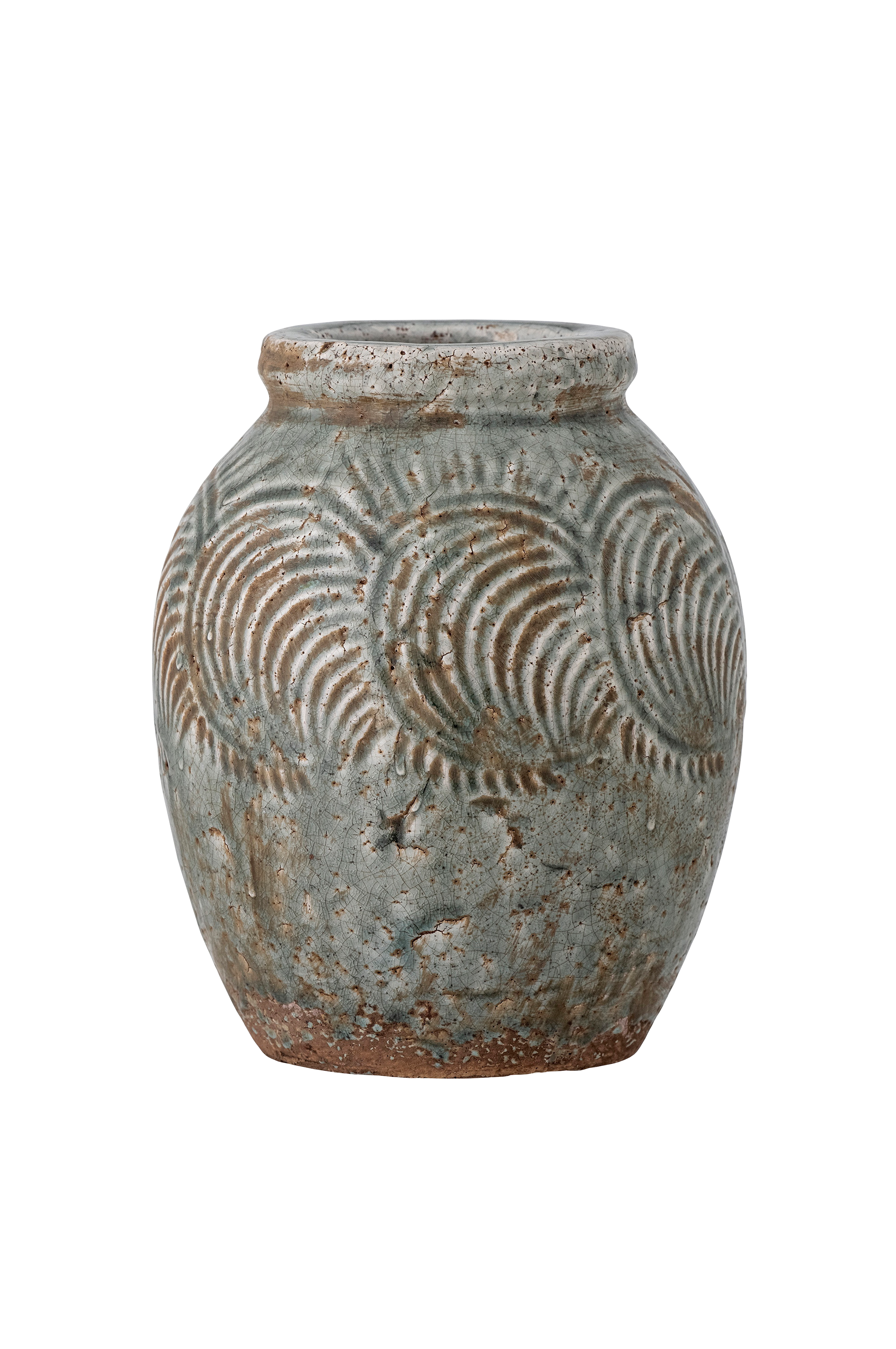 Damian vas från Bloomingville av terrakotta är en rustik vas. Vasen har en vacker, grön reaktiv glasering och ett graverat, abstrakt mönster. På grund av glaseringen och eftersom produkten är handgjord kan färgerna variera. Perfekt för torkade blommor, eftersom den inte är 100% vattentät.