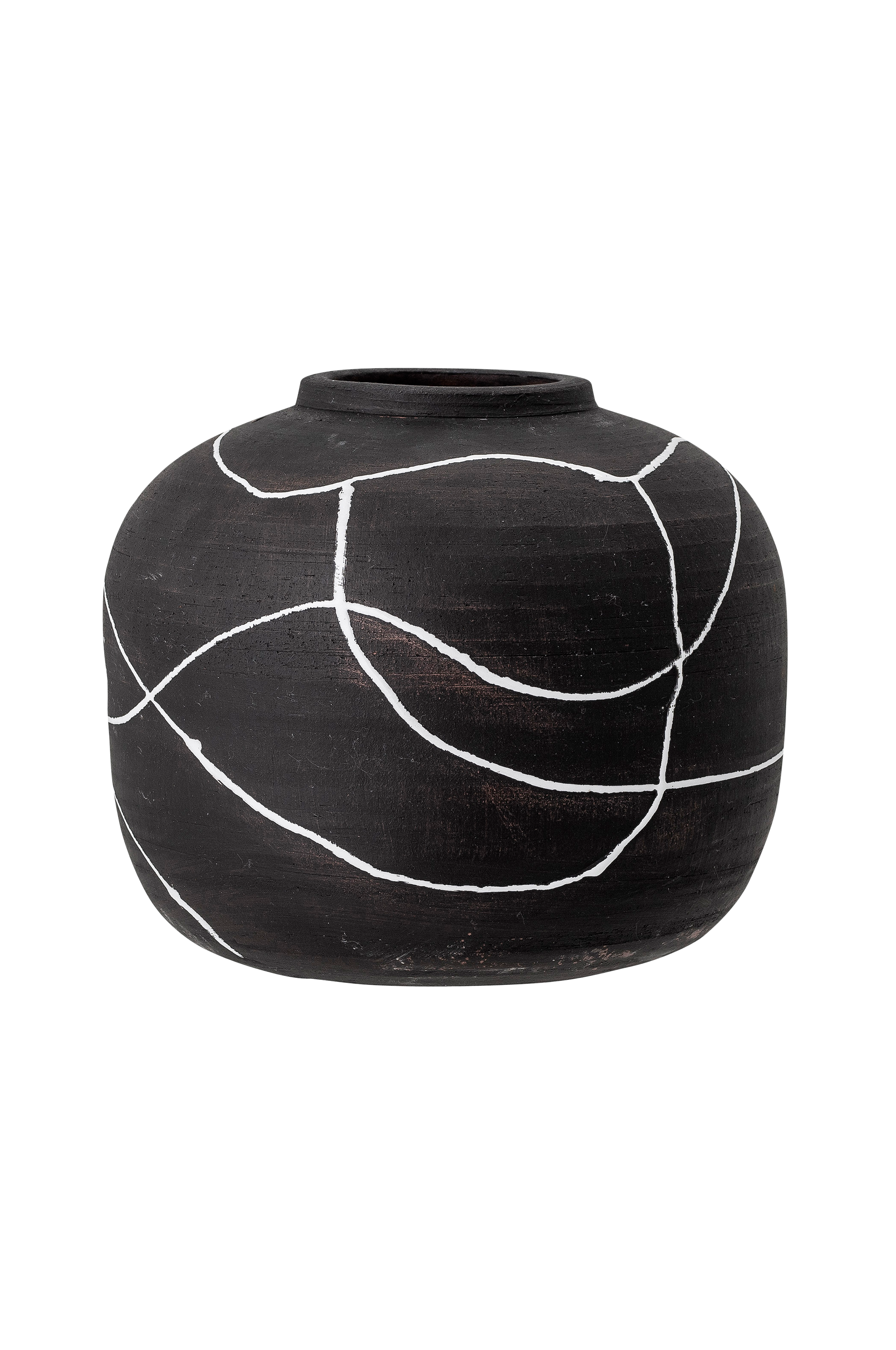 En dekorativ vas i något dramatisk stil, med svartvitt kontrastmönster. Vas av terrakotta i matt, svart färg, med dekorativt mönster i skinande vit färg. Vaserna är handmålade, vilket gör varje vas unik. Var du än ställer vasen kommer den svarta färgen stå i fin kontrast till bordet, fönsterbrädan, byrån eller hyllan den står på.