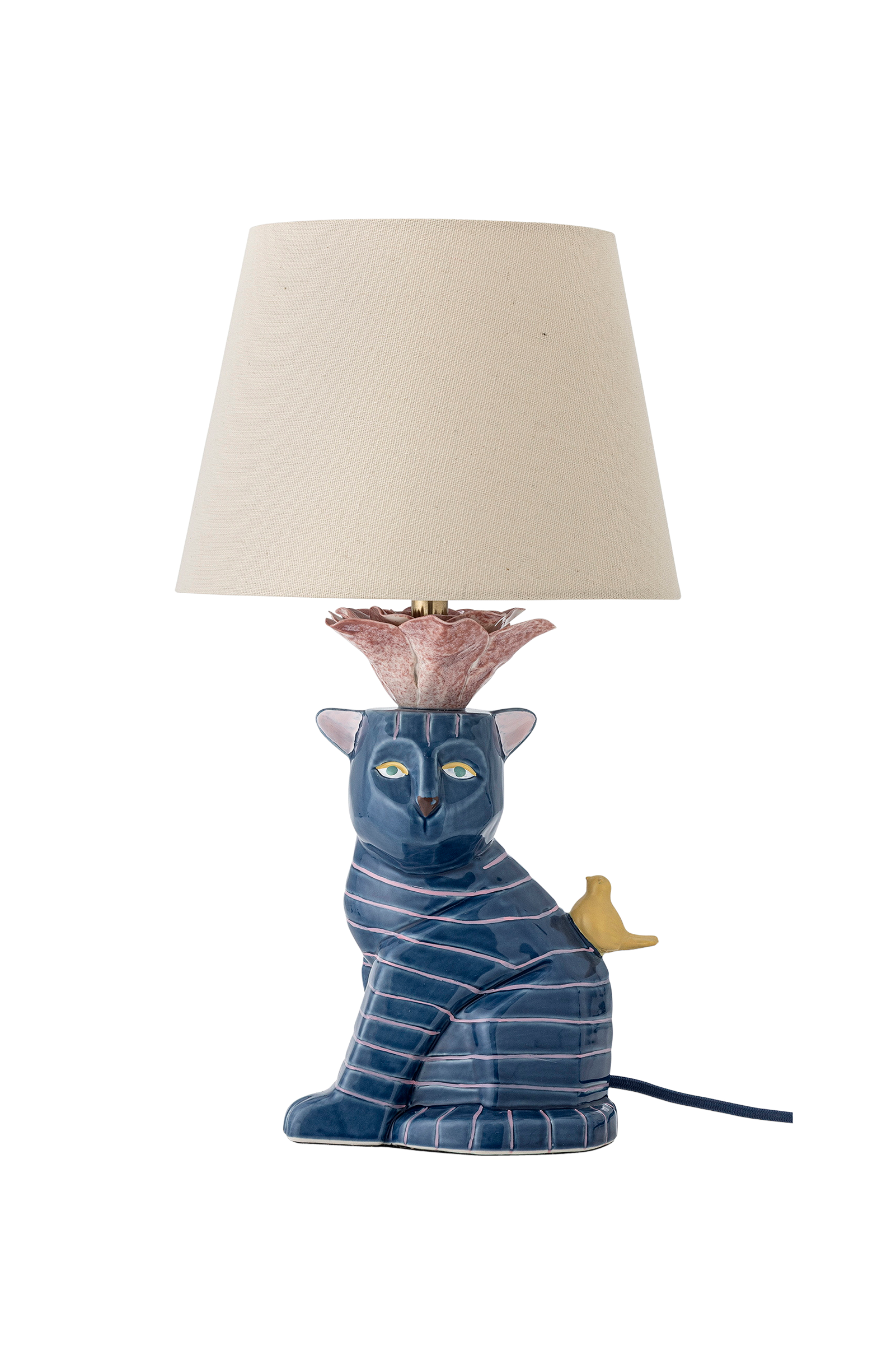 Bordslampan eri från bloomingville har en stengodsbas formad som en katt, accentuerad med fina ränder, uttrycksfulla ögon och en liten fågel. Lampskärmen i linne vilar på en rosliknande detalj. Små variationer i mönster och intensitet kan förekomma, vilket gör varje föremål unikt.