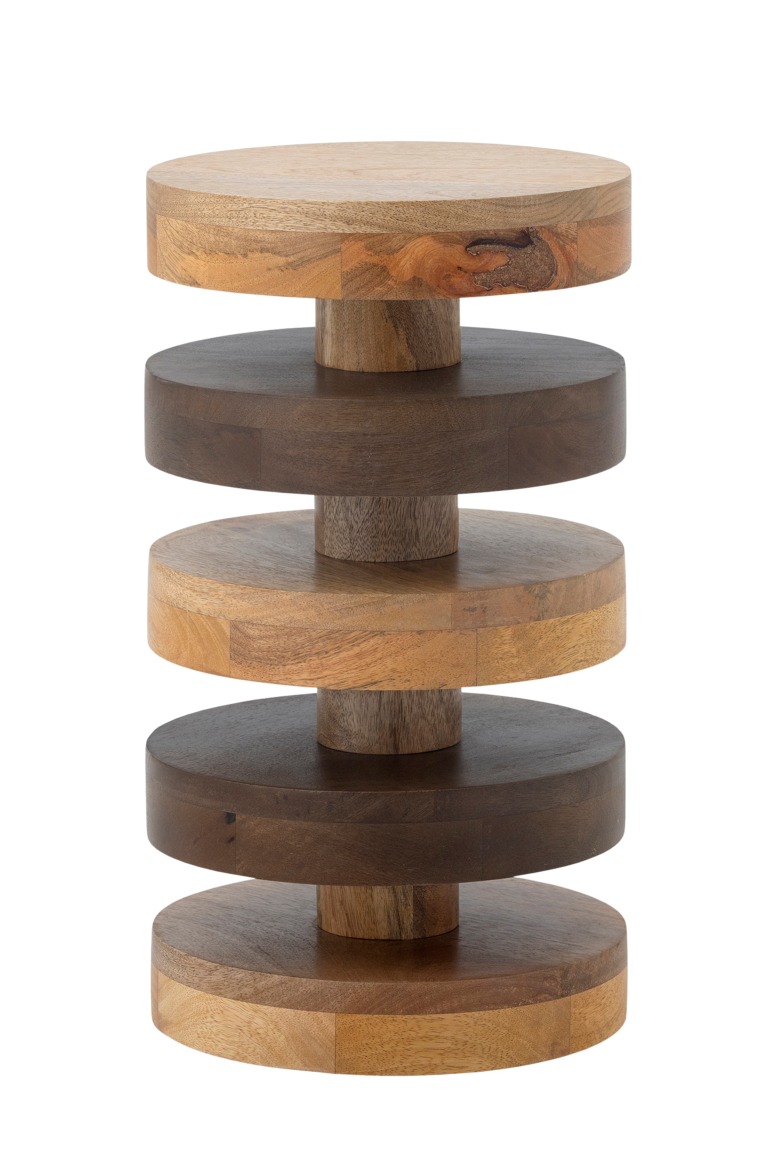 franka sidobord från bloomingville är en stilren möbel tillverkad av fsc-certifierat mangoträ. Bordets unika design, med ljusa och mörka nyanser av mangoträ, skapar en slående kontrast som ger karaktär till varje interiör. Dess skulpturala form gör det idealiskt som både ett praktiskt och dekorativt element, oavsett var det placeras. Mått: d25xh45 cm