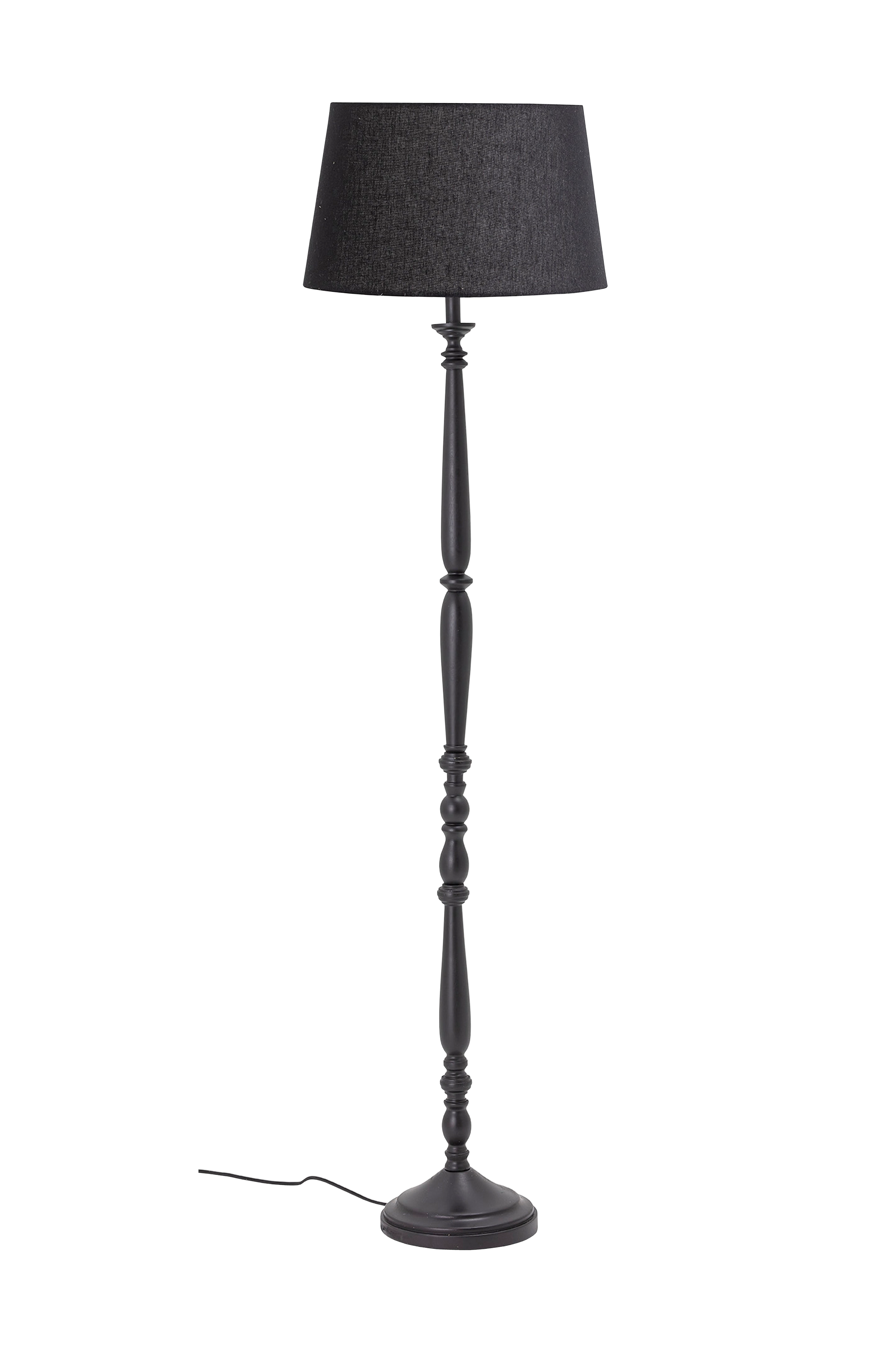 Vacker golvlampa av svarvat svartmålat gummiträ och linne skärm. Ljusknapp på golvet. Diameter 42 cm. Levereras omonterad.