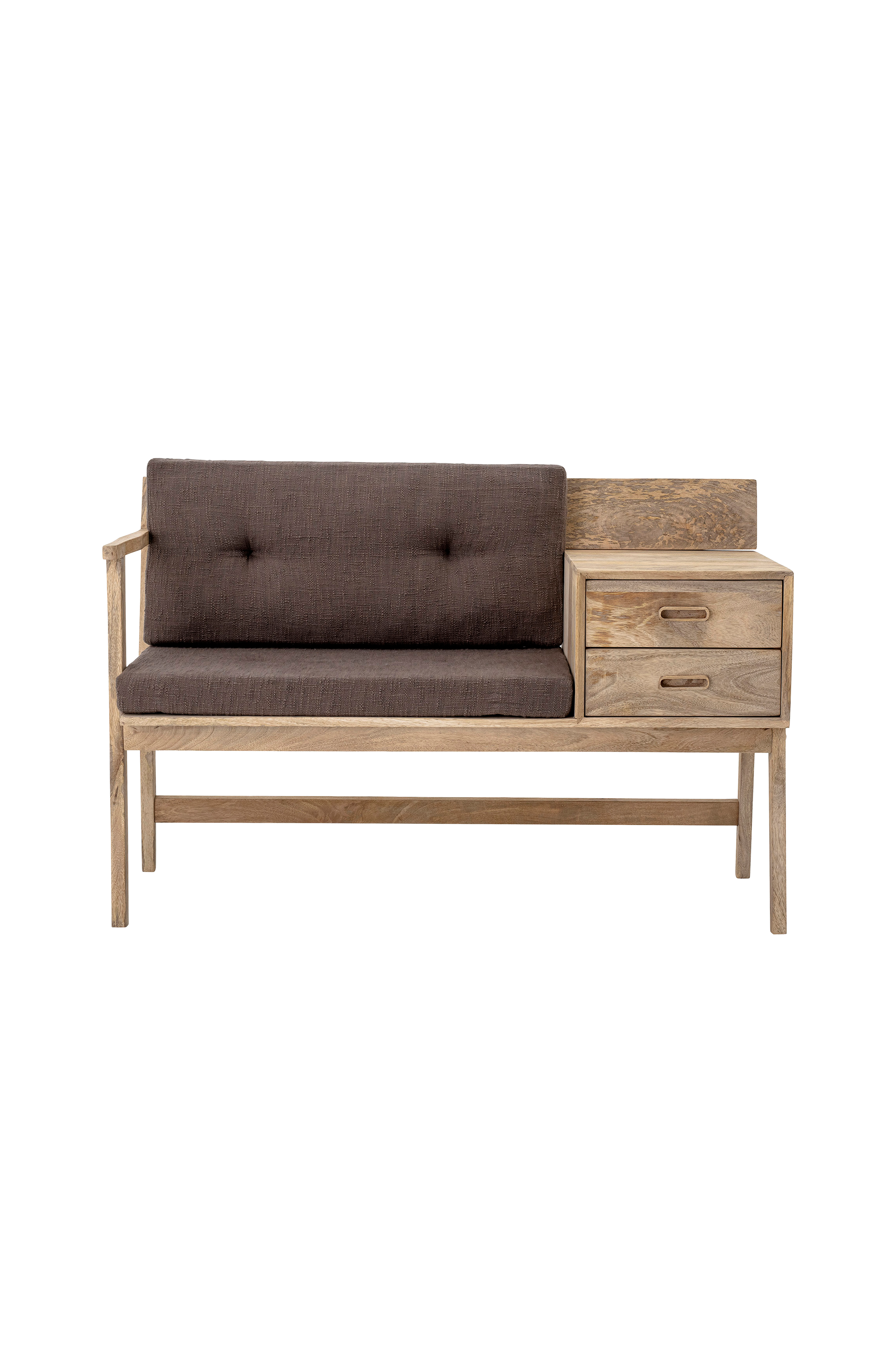 En klassisk hallbänk av mangoträd och stoppad dyna med bomullstyg och polyesterfyllning. Två lådor för förvaring. Levereras monterad.