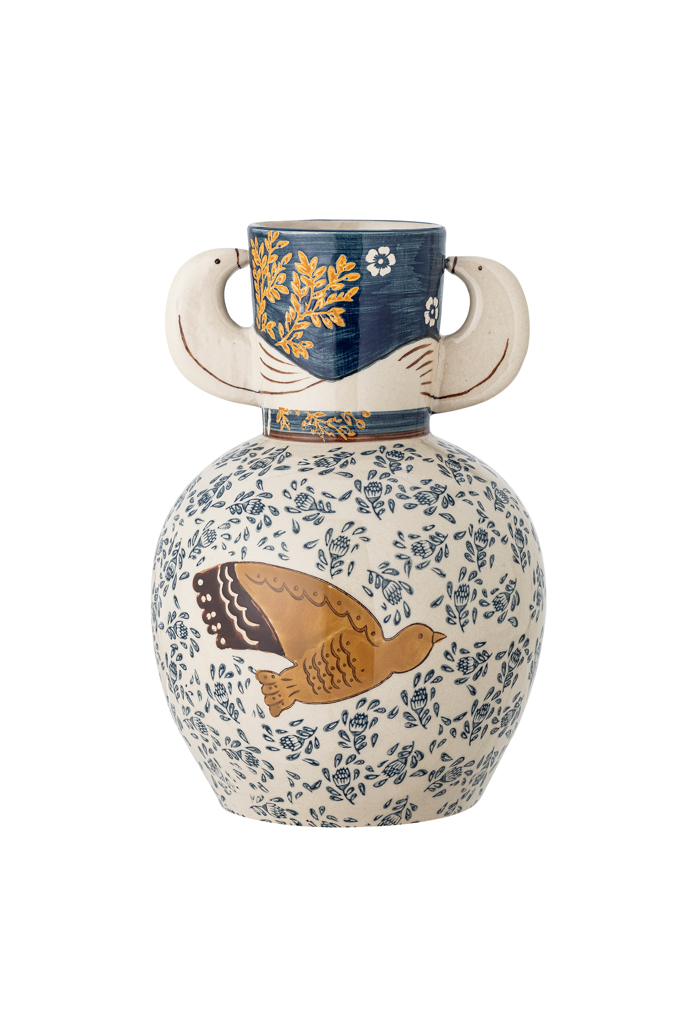 hezha vasen från bloomingville är en unik, handdekorerad vas med fina detaljer. Den har en präglad design och tryckta fågelmotiv i varma färger, vilket ger den ett distinkt utseende. Nyanserna av blått, brunt och gult ger en charmig och varm touch som skapar en mysig atmosfär. Mått: d16,5xh23,5 cm