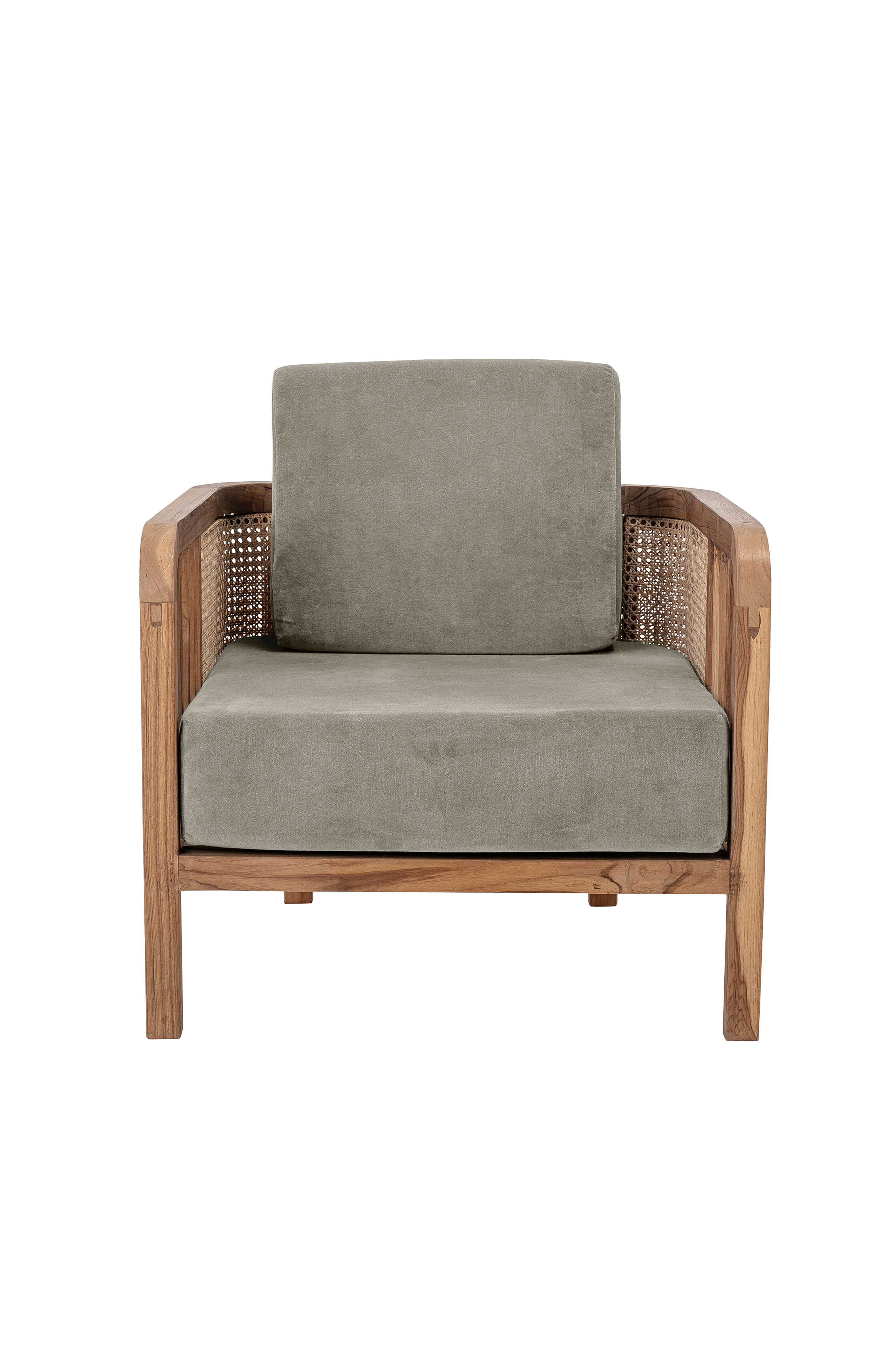 Felucca loungefåtölj från Creative Collection är en trendig, franskinspirerad loungefåtölj av teak i varma toner. Den har en djup sits som ger hög loungekomfort. Dynorna av sammet har en mjuk, grön färg. Med vackra detaljer i rotting och mjukt rundade former hamnar den i blickfånget. Den skulle passa perfekt i uterummet.