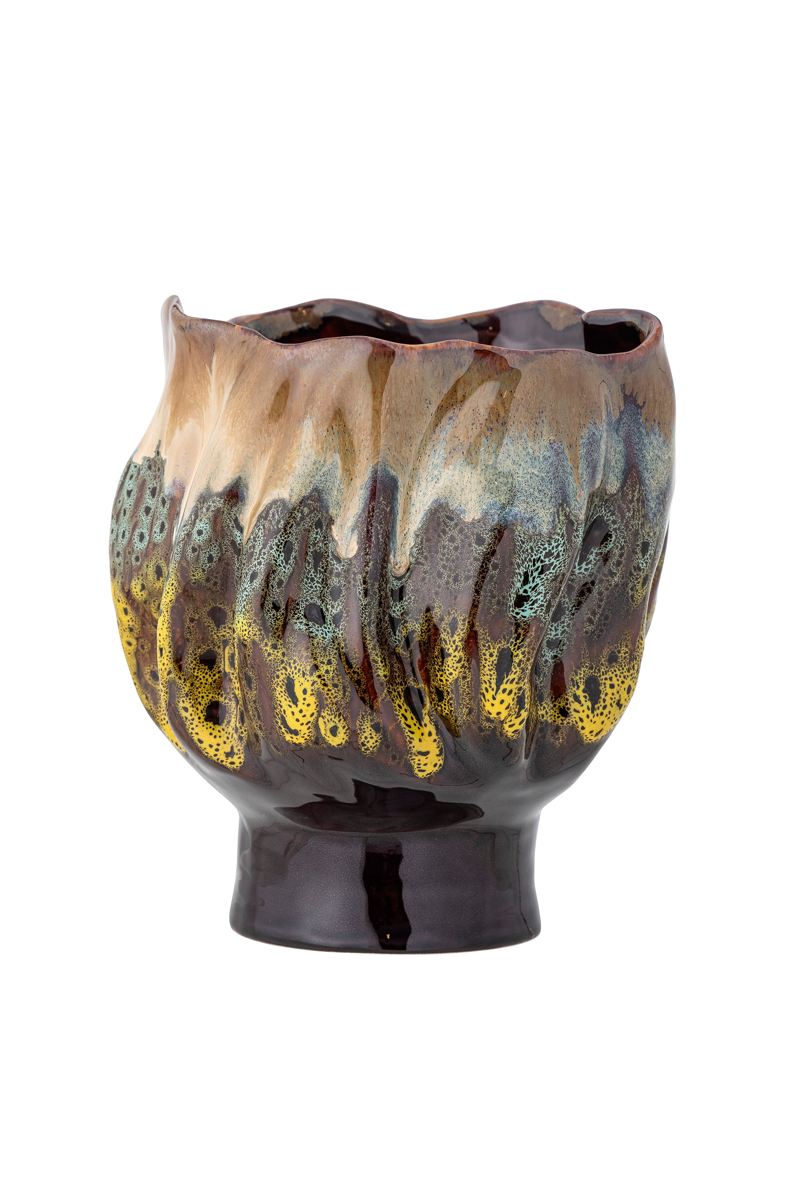 Blomkrukan mahnoor från creative collection är en iögonfallande blomkruka på fot med en organisk look. Den vackra blomkrukan är handmålad i en unik glasyr med en rinnande effekt och varma jordnära färgnyanser. Varje föremål varierar och är unikt. D21xh24 cm